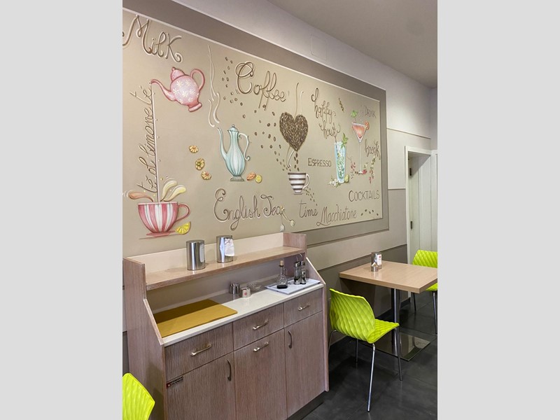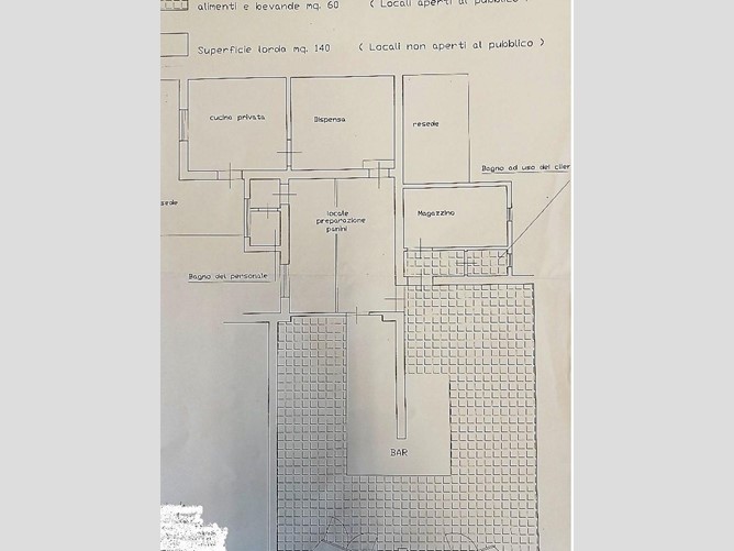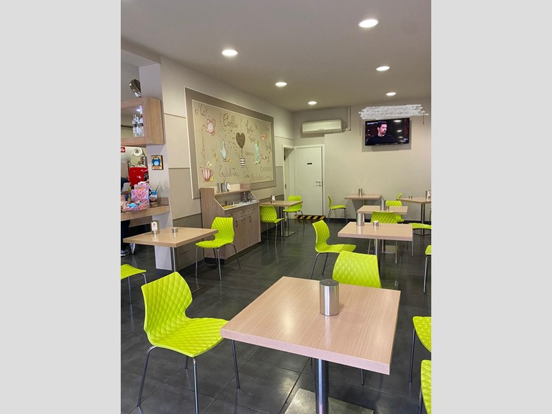 Il fondo di 140 mq si suddivide in sei vani tra cui 60 mq adibiti all'attività e completamente arredato di bancone - bar, vetrina per i pezzi dolci e salati, macchina del caffè, etc... nella sala sono posizionati vari banconi per la colazione e tavolini per circa 20/25 posti a sedere; proseguendo troviamo un antibagno e bagno per il pubblico, un magazzino, sala per preparazione pranzi, il secondo bagno sempre con antibagno per il personale, inoltre sul retro abbiamo una grande cucina e una stanza dispensa di circa 20 mq. Il bar è stato ristrutturato completamente con finiture moderne e accessoriato di condizionatori.
