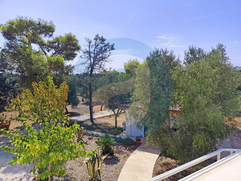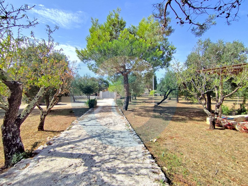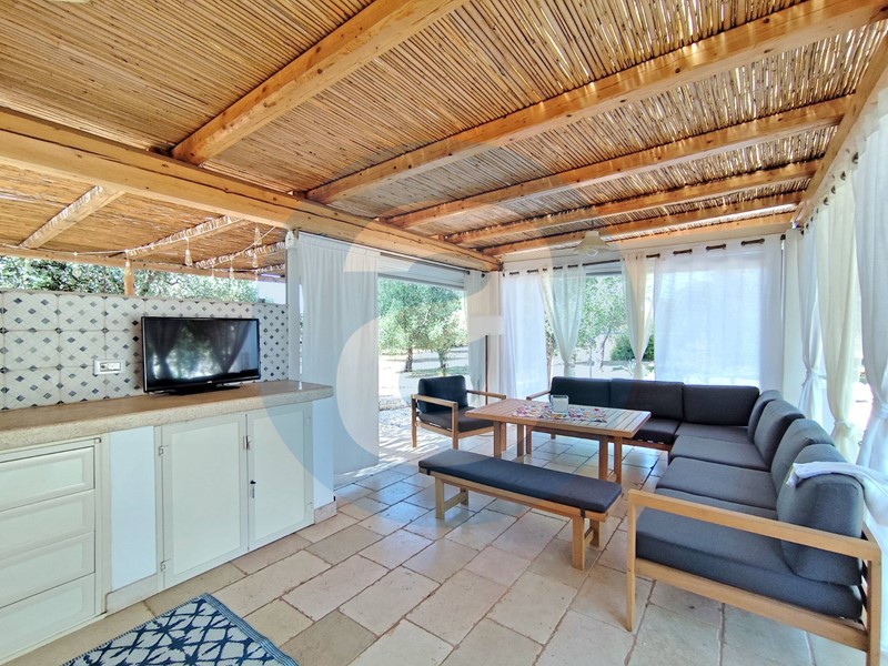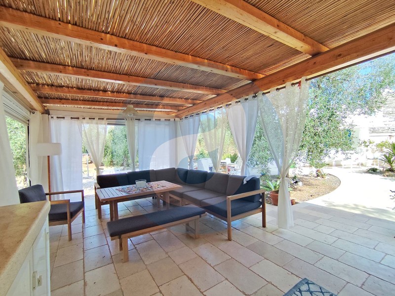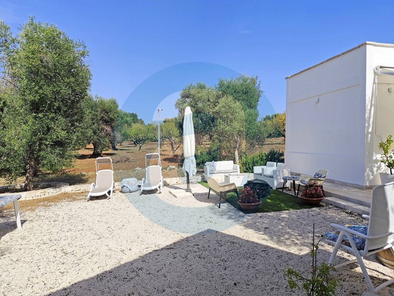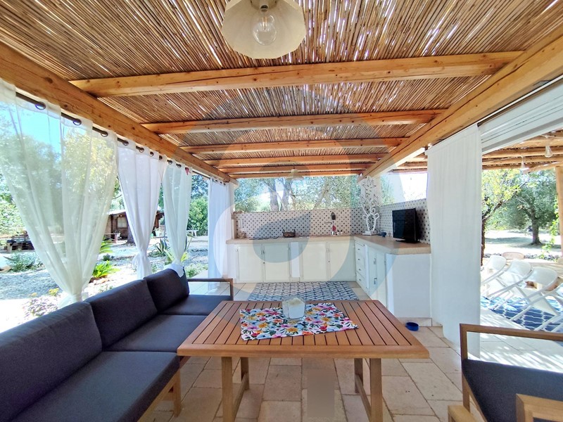 ESTERNO: Superficie esterna di 5.200 mq arricchito dalla presenza di circa quaranta ulivi, di alberi da frutto (mandorle, fichi, pere, gelsi, nespole, ciliegie) e da alberi e piante della macchia mediterranea. Pergolato regolare di 25 mq, in legno e muratura, allestito con cucina e zona soggiorno. Riserva idrica per acqua potabile. Riserva idrica per recupero acque piovane. Vasca imhoff. Doccia esterna. Terrazzo calpestabile e raggiungibile da scala esterna. Area di parcheggio scoperta.