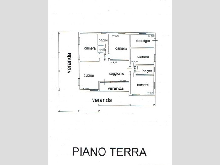 Composizione interna: cucina, soggiorno, due disimpegni, 4 camere matrimoniali, 2 bagni, magazzino, ampia verande di circa 80 mq. In caso di necessità, due camere, bagno e porzione della veranda possono essere resi indipendenti rispetto all'immobile principale.