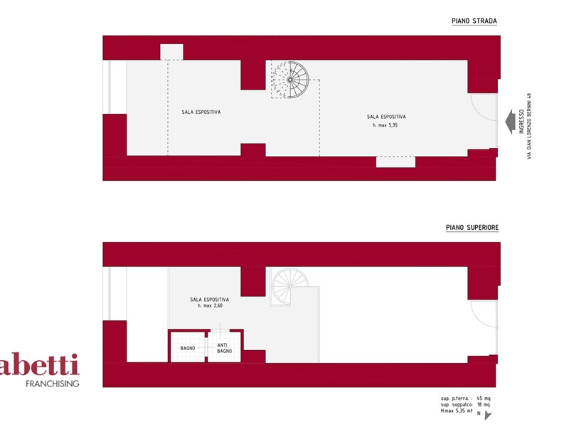 Il locale dispone di una vetrina fronte strada che assicura massima esposizione, e si sviluppa su una superficie di circa 45 mq calpestabili. L'altezza interna, pari a 5,35 metri, ha consentito di studiare un progetto di ristrutturazione che prevede l'inserimento di una scala interna e di un soppalco di 18 mq con altezza di 2,60 metri. Il locale verrà consegnato ristrutturato secondo questo progetto, così da garantire uno spazio moderno, funzionale e pronto all'uso per molteplici tipologie di attività.