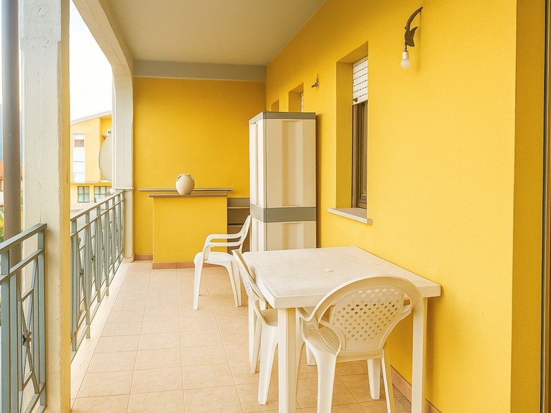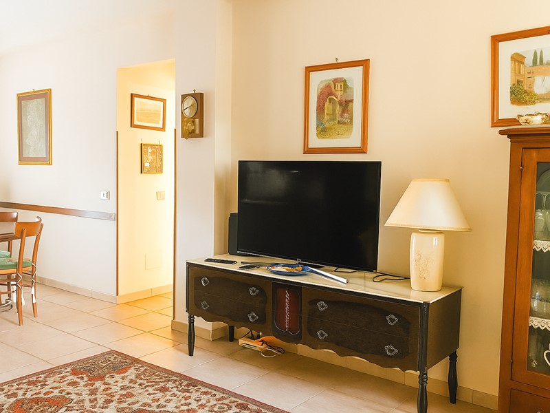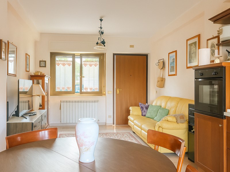 La zona giorno si compone di un soggiorno con angolo cottura, caratterizzato da una doppia esposizione con uscite su lati opposti, ovvero sul giardino d'ingresso e su un ampio balcone riservato.