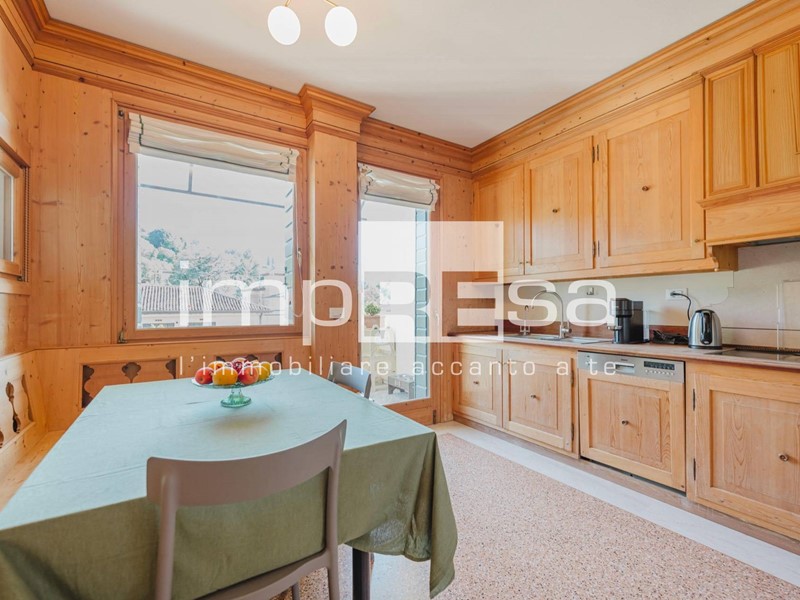 La cucina separata, con dettagli eleganti in legno, offre tramite le porte finestre, luminosità e accesso a un generoso pergolato esterno, dotato di un terzo caminetto.