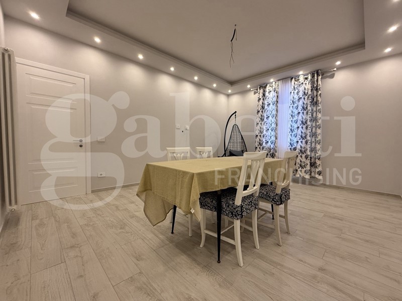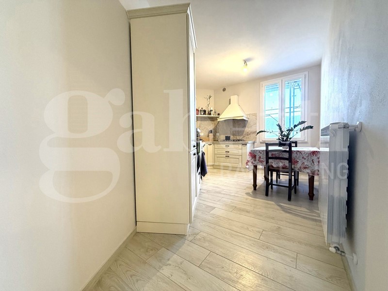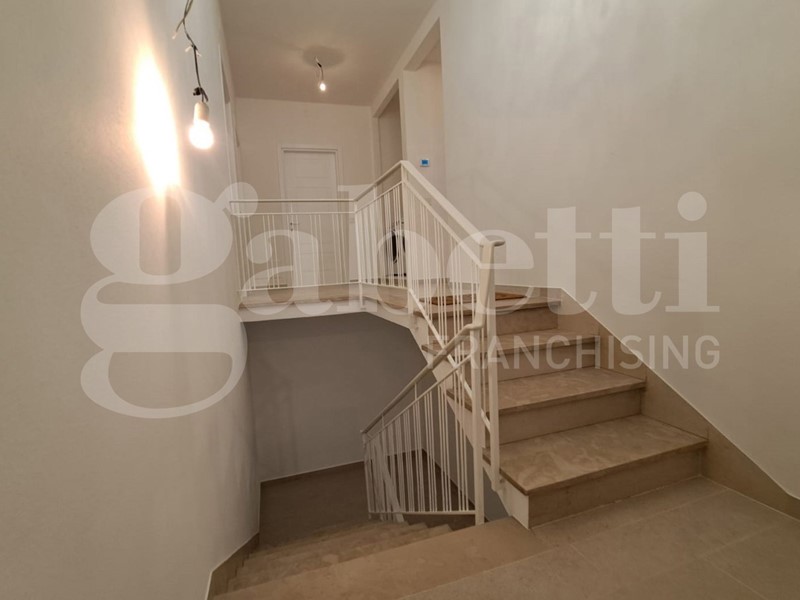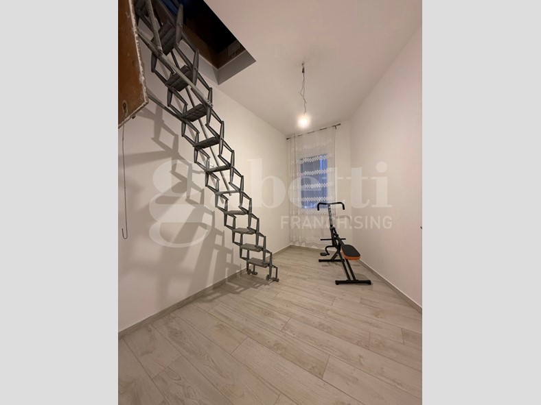 Al piano terra il portoncino si apre sul disimpegno con una comoda scala che ci accompagna al primo piano dove si sviluppa l' intero appartamento composto da ampio e luminoso salone con illuminazione a faretti, cucina abitabile con ripostiglio, camera matrimoniale, bagno finestrato con doppio lavabo e doppio box doccia, piccolo angolo lavanderia, camera media , e studio/ camerina con scala retrattile che dà accesso al sottotetto a uso ripostiglio.