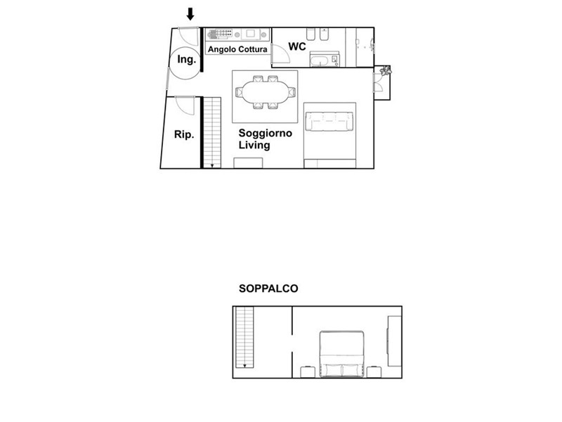 Al piano principale l'ingresso conduce a un soggiorno con cucina, oltre a un ripostiglio e a un bagno ben organizzato.
