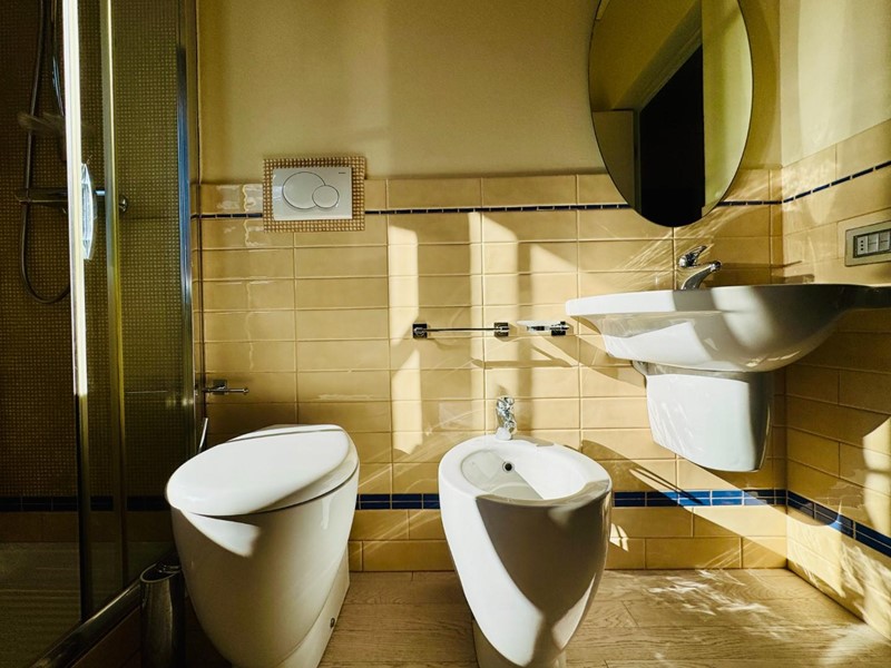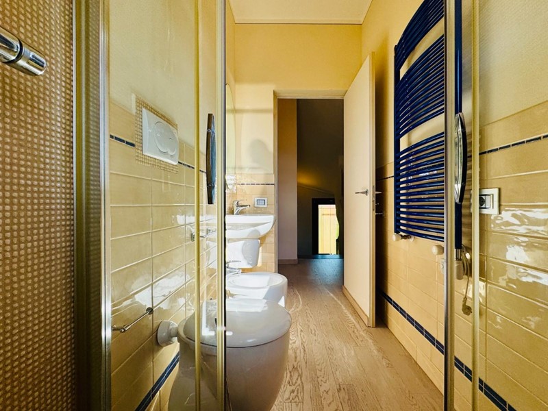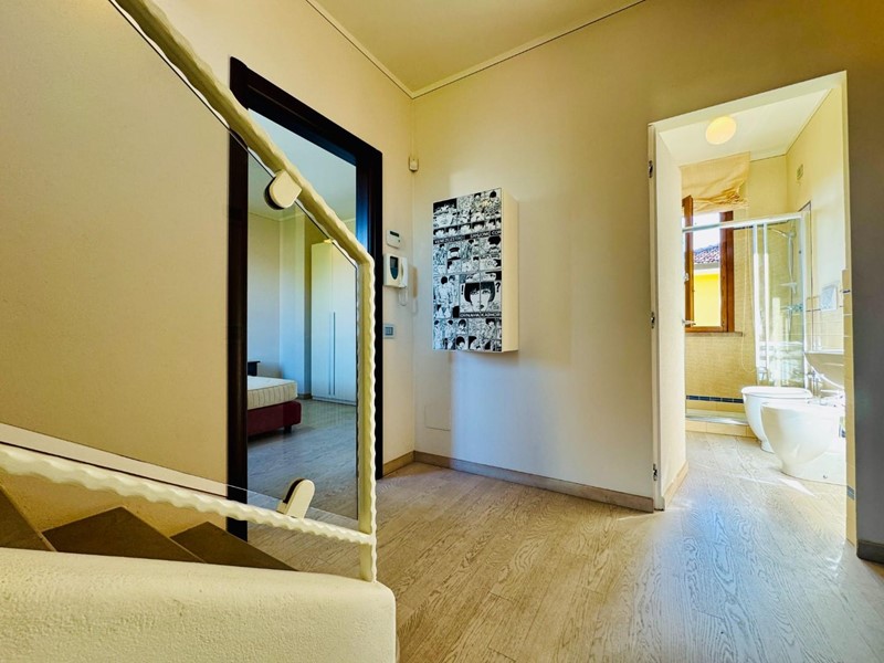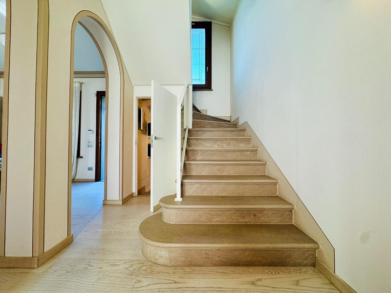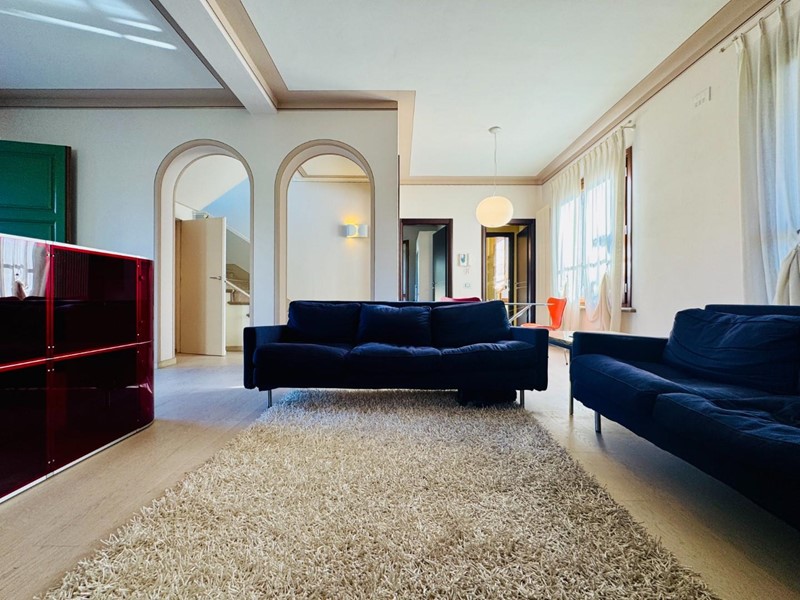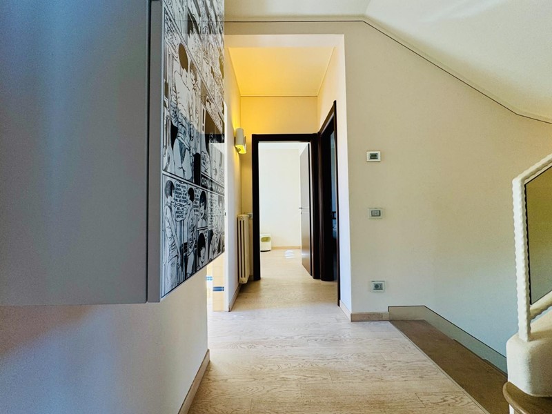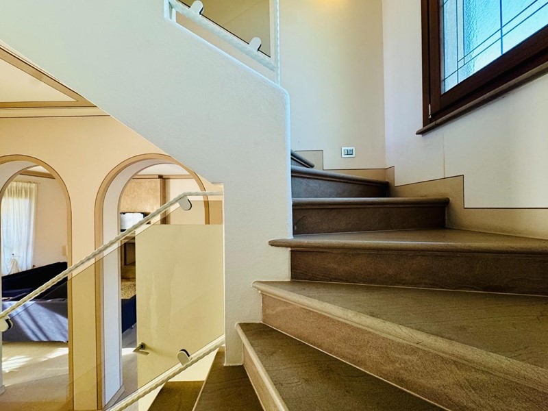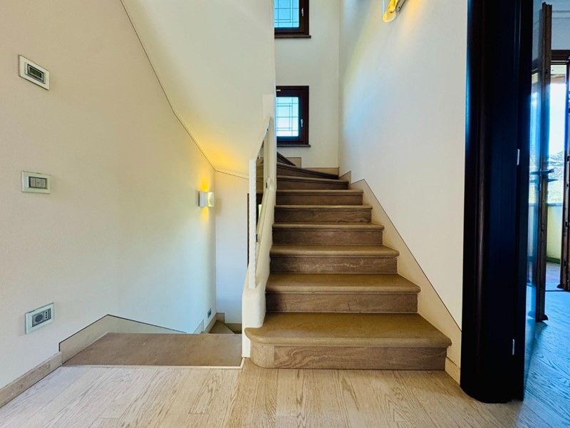 L'immobile si sviluppa su più livelli. L'ingresso principale avviene nel salone suddiviso in area TV e sala pranzo. La cucina è abitabile e dispone di un'apertura che ci accompagna verso un piacevole portico esclusivo che domina il giardino. Questo piano è servito da un primo bagno. La zona notte è posta ai piani superiori. Le camere da letto sono quattro, tutte di importanti dimensioni e servite da balcone rendendole così luminose e ariose. I due livelli dispongono di altri tre bagni con doccia.