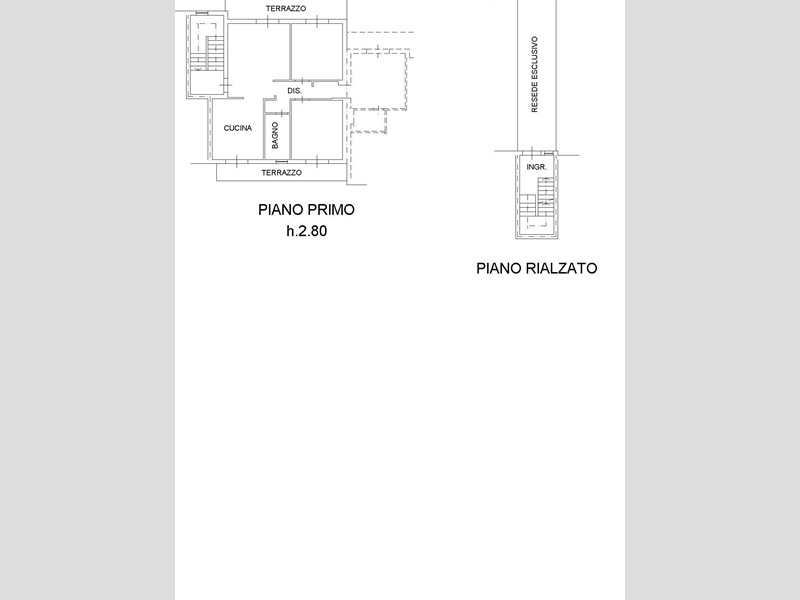 L’accesso avviene dal resede frontale, attraverso una scala privata che conduce all’abitazione principale e, al tempo stesso, al piano seminterrato.