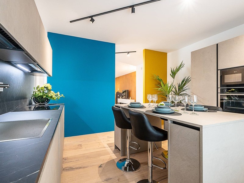 Lingresso introduce a un ambiente raffinato e ben articolato, dove la cucina abitabile, realizzata su misura e dotata di ogni comfort, dialoga con un ampio soggiorno luminoso e accogliente, perfetto per accogliere ospiti o vivere momenti di relax in un contesto esclusivo.