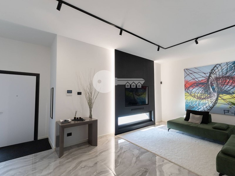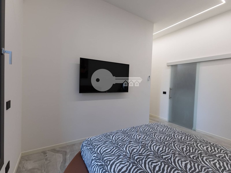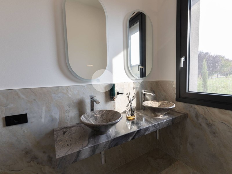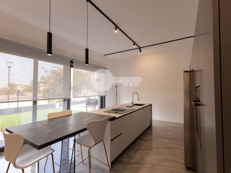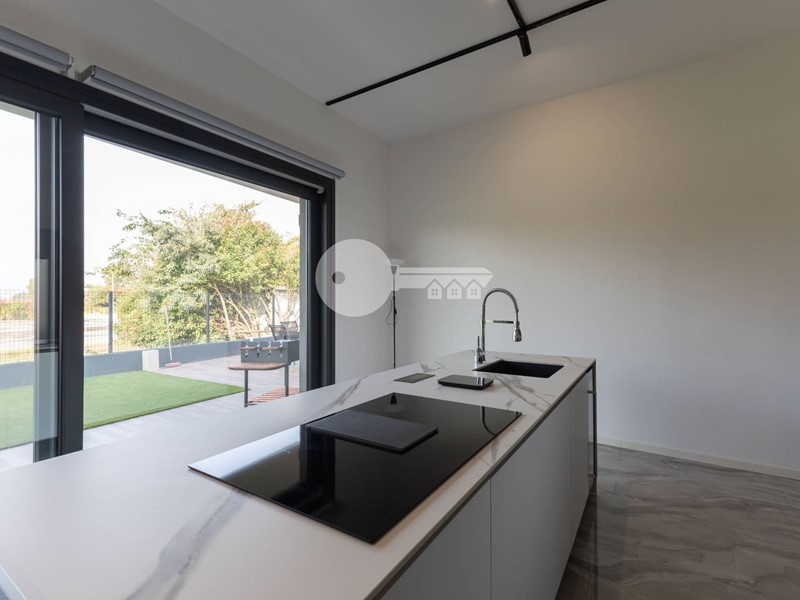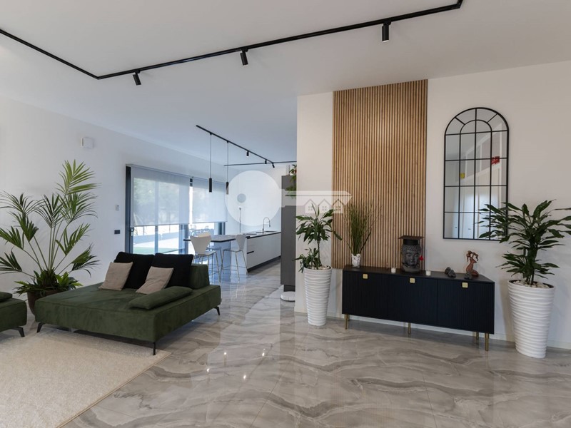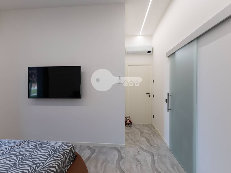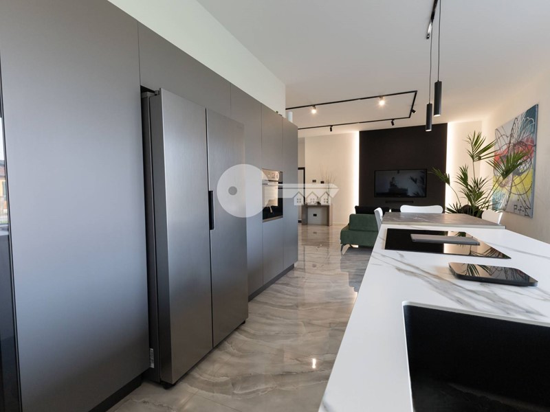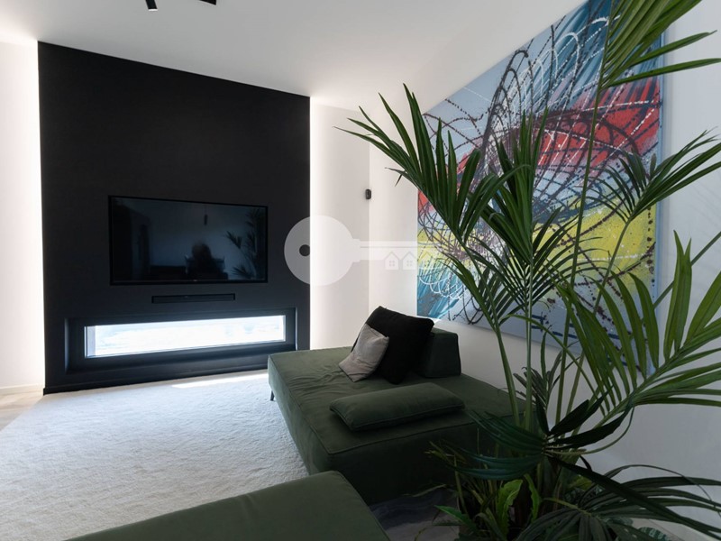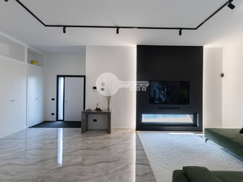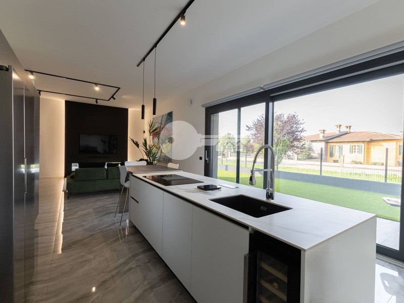 Allinterno, lampia zona giorno open space è illuminata da una grande vetrata che valorizza langolo cucina e regala continuità tra gli spazi interni ed esterni. Un dettaglio di pregio è la finestra caratteristica del soggiorno che si affaccia direttamente sulla piscina, creando unatmosfera raffinata e suggestiva.