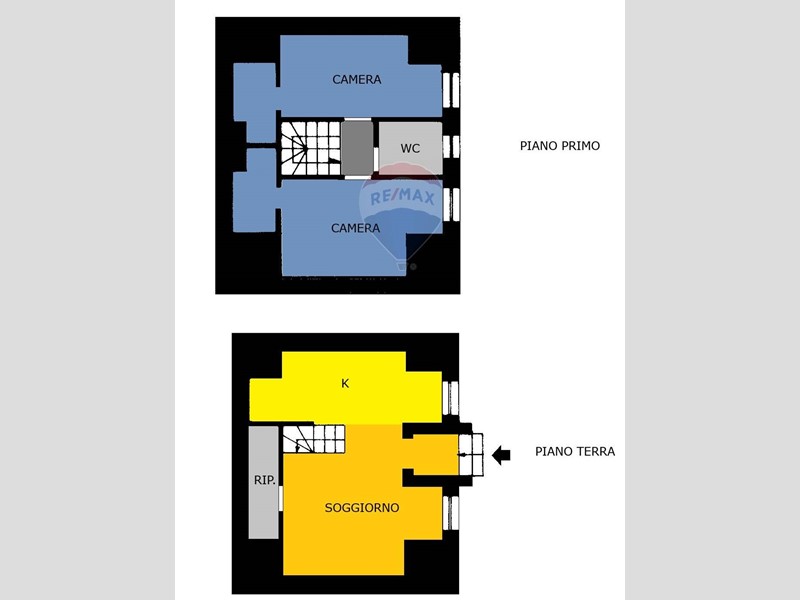 Piano Terra (T): ingresso in saloncino con due finestre, ripostiglio, cucina con angolo cottura