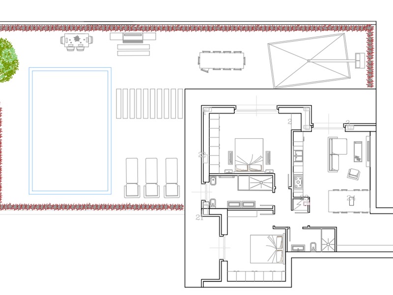 L'abitazione si compone di ampia zona giorno open space con cucina a vista, 2 camere da letto luminose e ben distribuite, doppi servizi finestrati, lavanderia e giardino privato.
