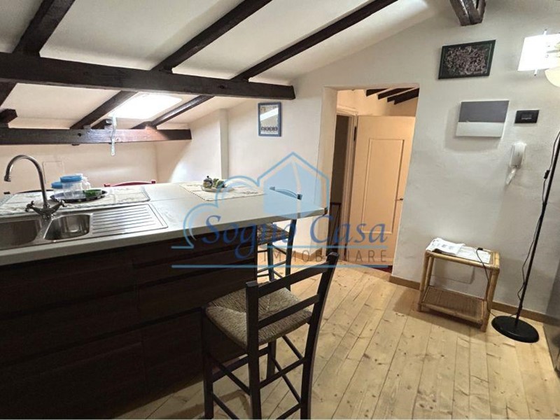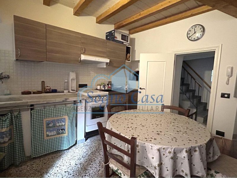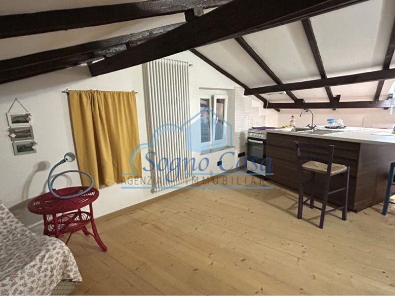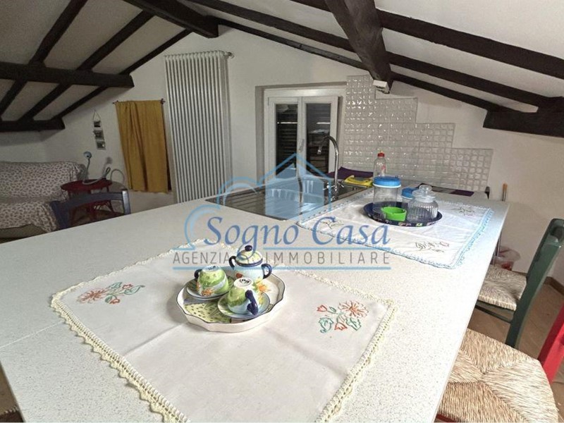 Secondo piano mansardato: caratteristico open space con travi a vista, cucina con penisola, camera matrimoniale con ulteriore letto singolo; bagno finestrato al pianerottolo, funzionale e curato.