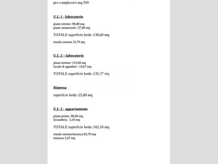 Il complesso si presenta TOTALMENTE DA RISTRUTTURARE ed ha una superficie lorda complessiva di mq. 500, oltre la rimessa e il lastrico di quasi 85 mq.