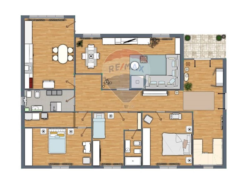 La situazione attuale al piano terra si presenta anche facilmente trasformabile in un appartamento quadrilocale: