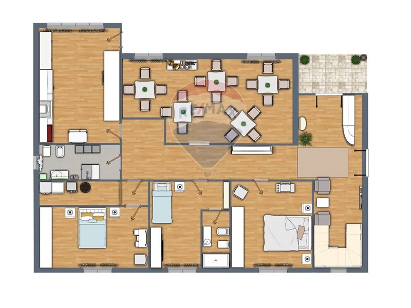 la grande sala da pranzo con la cucina industriale separata, oltre a tre camere di cui due col bagno interno ed un bagno comune con accesso dal corridoio.