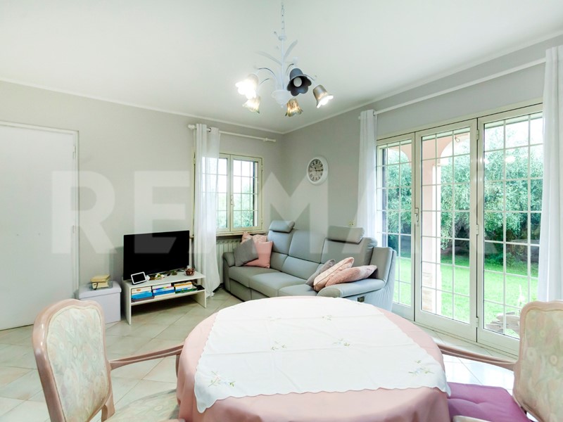Dal salone si accede direttamente al giardino tramite porta finestra, creando una continuità tra interno ed esterno.