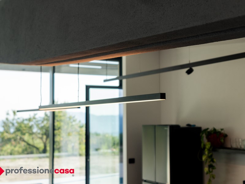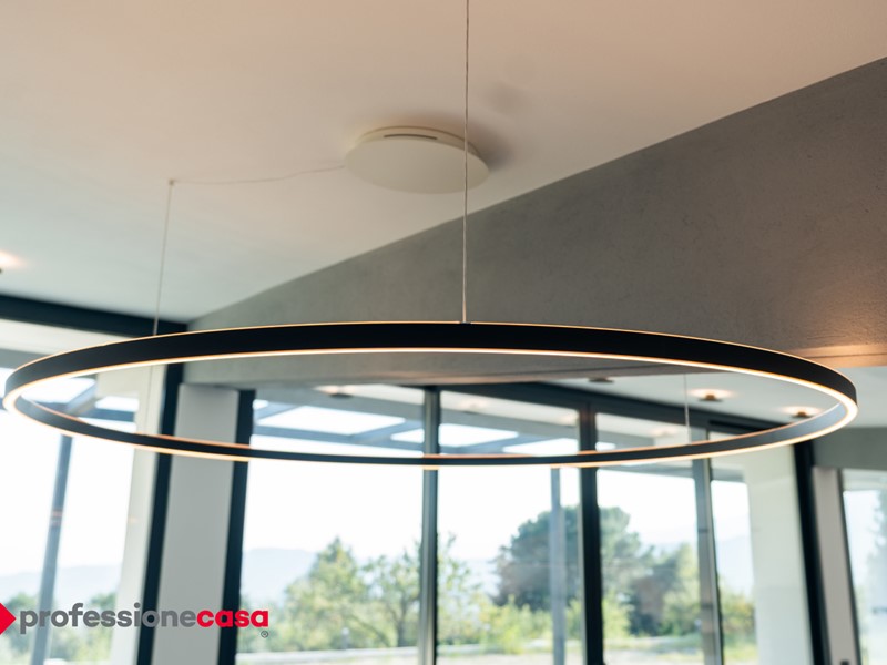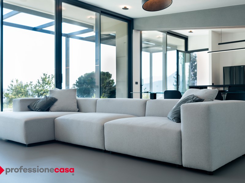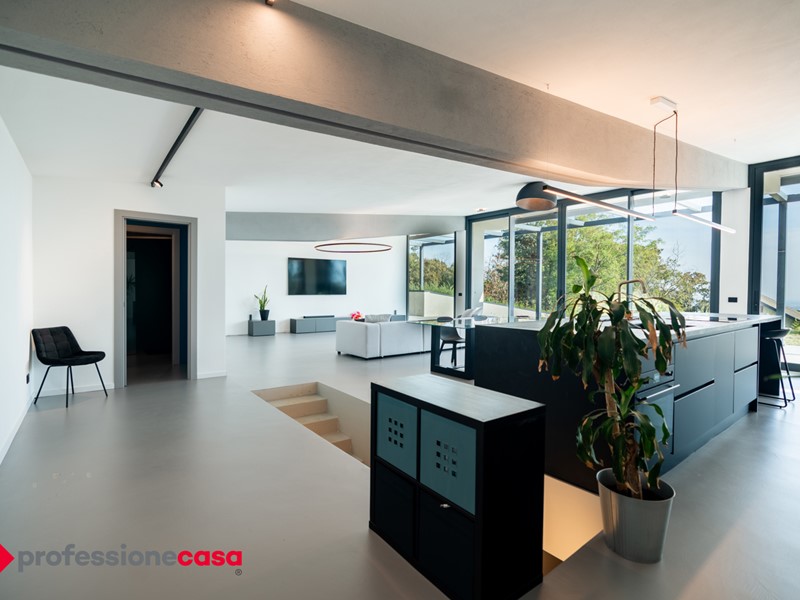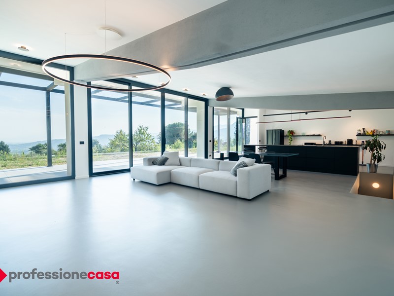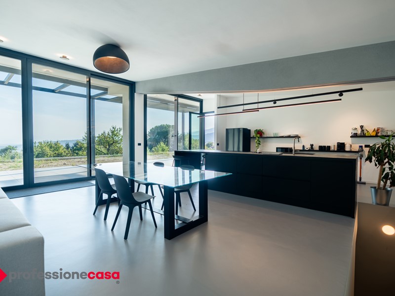 L'ingresso si apre su un ampio e luminoso soggiorno, caratterizzato da grandi vetrate che regalano una spettacolare vista panoramica sulle colline. La cucina è abitabile e ben collegata alla zona giorno, perfetta per chi ama cucinare e vivere la casa con convivialità.