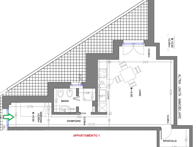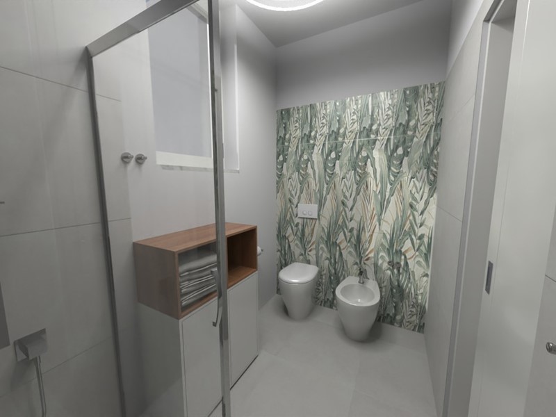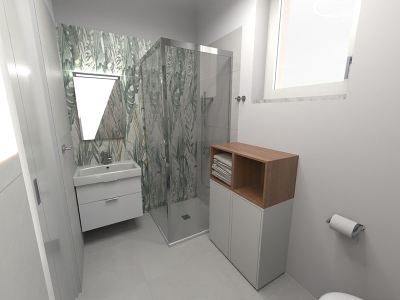 L'immobile si apre su un comodo disimpegno che conduce alla zona living open space, con angolo cottura, ripostiglio e bagno finestrato completo di antibagno.