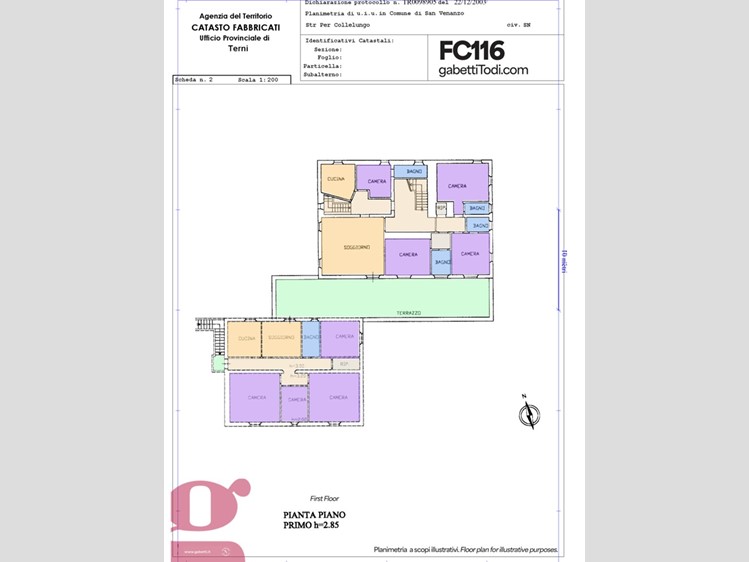 Al primo piano, cui si può accedere liberamente sia tramite la scala esterna che dal terrazzo, ponte di collegamento tra i fabbricati, troviamo un appartamento articolato in soggiorno con cucina, 4 camere, un bagno ed un ripostiglio.