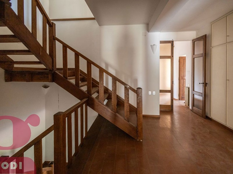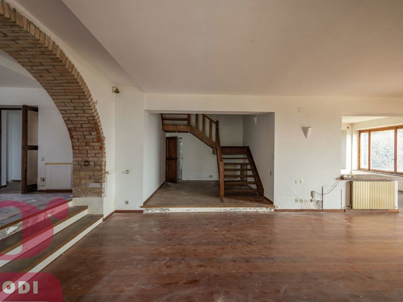 Al piano terra un grande arco in mattoni attraversa la zona living di 110 mq, distinguendo visivamente due ambienti e scandendo i volumi di due aree funzionali senza interrompere la continuità dello spazio con barriere nette. Due pareti finestrate garantiscono luminosità e vista sul giardino. Un'intera parete è invece dedicata al particolare camino in mattoni, legno e con cappa in pietra. Le pavimentazioni in parquet e cotto conferiscono ulteriore tipicità. Sul medesimo livello troviamo anche due ripostigli, una cantina ed un bagno.