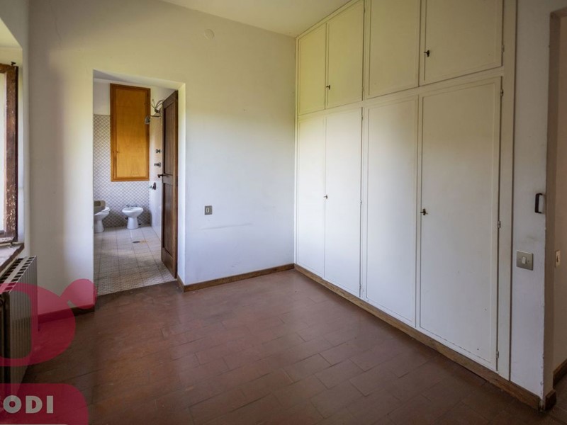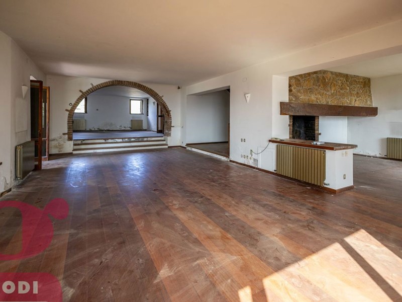 Al primo piano, collegato mediante due scale in legno indipendenti, troviamo un ampio soggiorno con cucina abitabile, un ripostiglio e la zona notte, composta da ben 4 camere e 4 bagni. Le camere lato nord godono di una piacevolissima vista sulla campagna circostante, mentre il soggiorno e le due camere lato sud hanno accesso diretto al TERRAZZO di 88 mq, da cui è apprezzabile un panorama veramente unico.