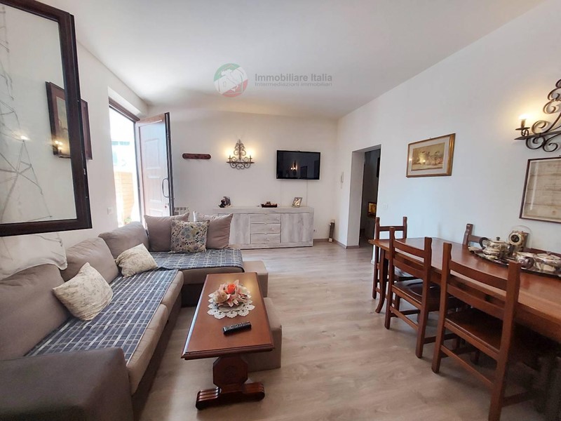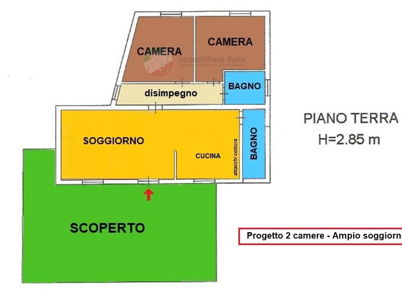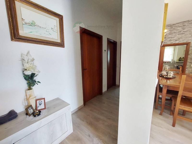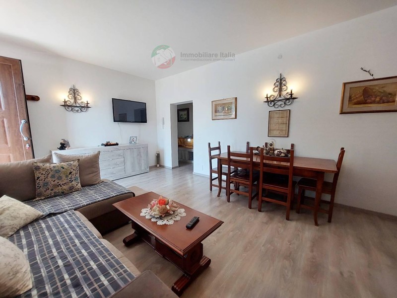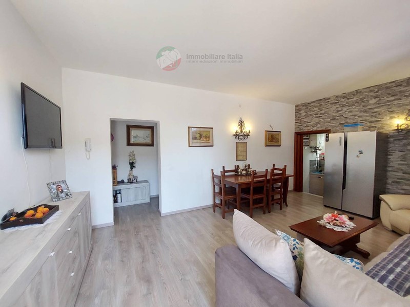 Ingresso nell ampio salone con cucinotto (ma sono predisposti gli attacchi anche nel soggiorno per creare un angolo cottura e rendere il vano attuale una lavanderia o ripostiglio).