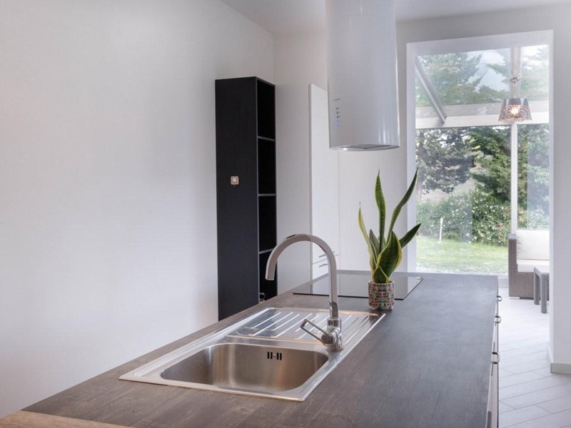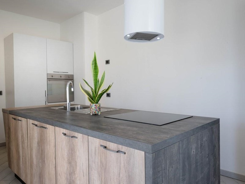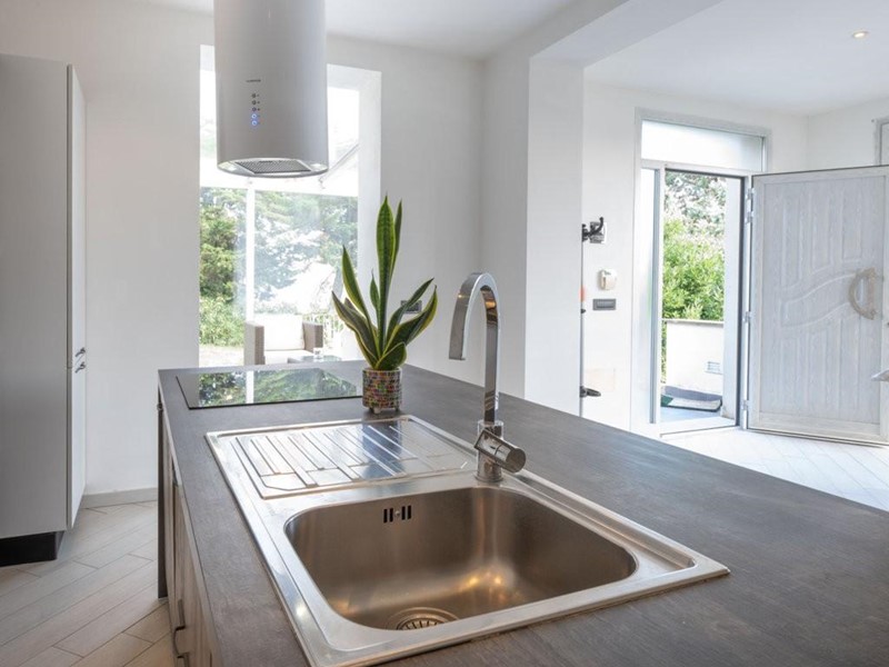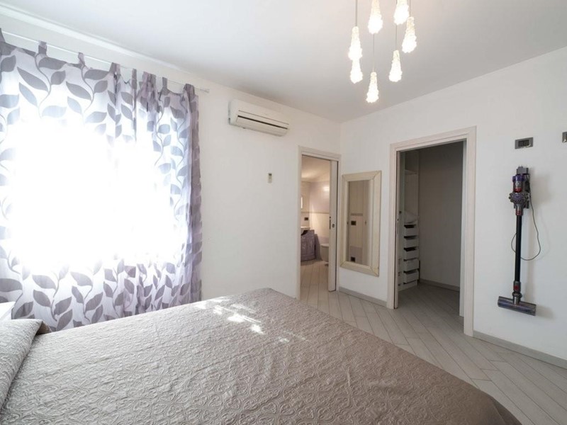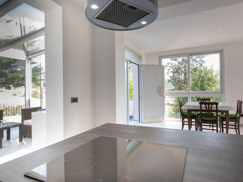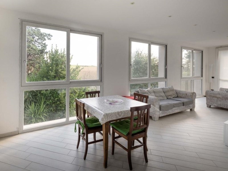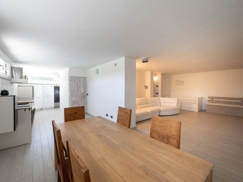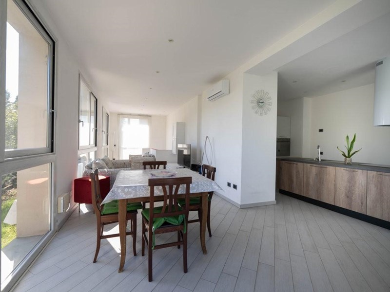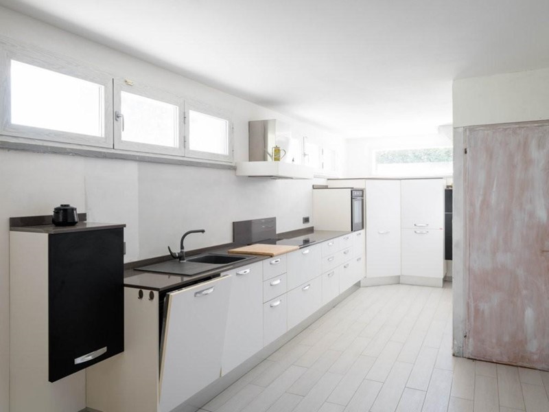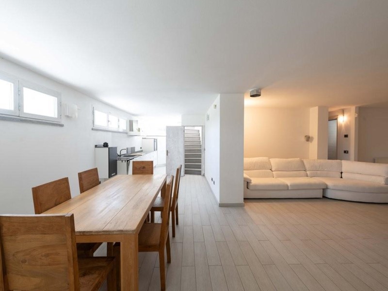 Al piano terra si accede dalla serra solare che immette al portone d'ingresso che si apre verso la cucina, con isola centrale, comunicante con la zona loggiato-soggiorno, illuminata da ampie vetrate scorrevoli con esposizione a sud. Dalla cucina si accede nel reparto notte che comprende due camere di cui una con cabina armadio, un comodo bagno e disimpegno.