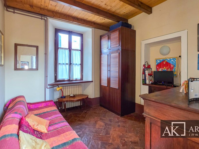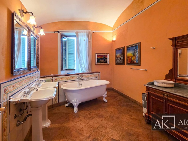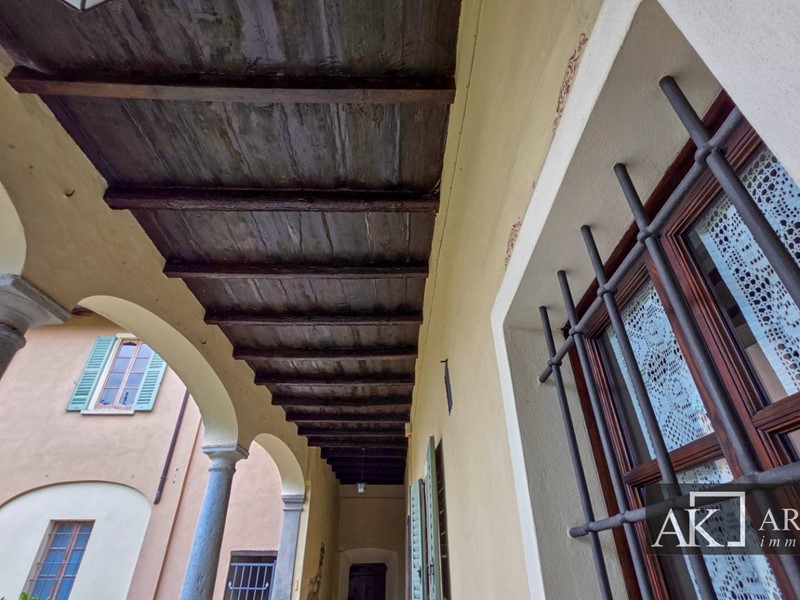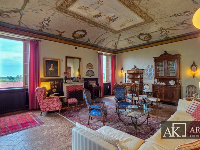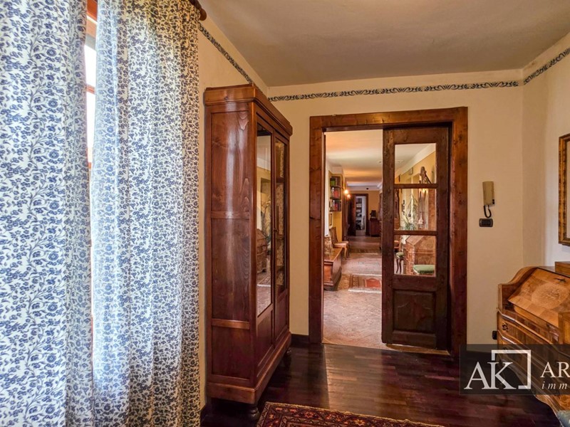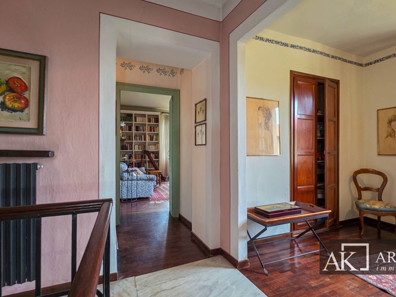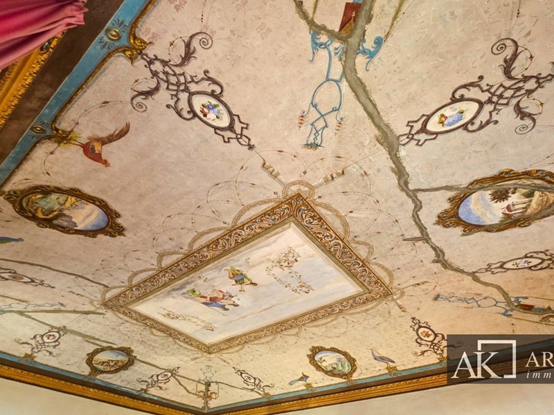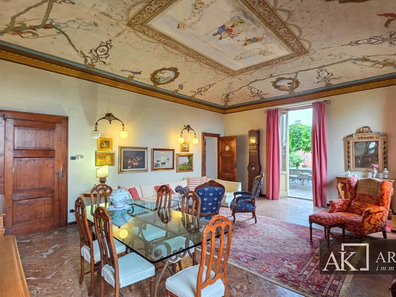 Lingresso è su ampio disimpegno dal quale si accede al grande soggiorno con soffitto affrescato, ci accolgono poi un salottino, la cucina entrambi con soffitto a cassettoni, un bagno a servizio della zona giorno ed un corridoio dal quale si raggiunge il giardino interno.