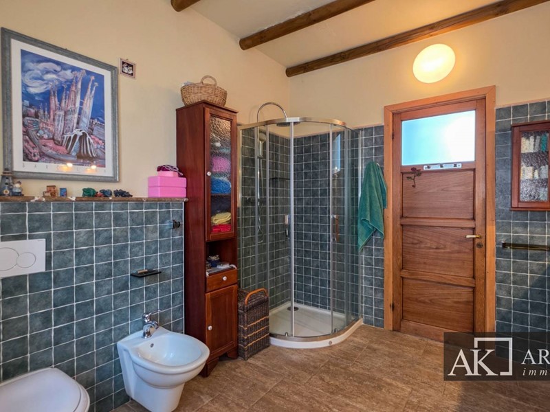 Il livello superiore, accessibile da due scale interne, è costituito da 3 camere da letto e 2 bagni di cui uno con bagno turco oltre ad ampio studio e balcone con vista panoramica ed altra camera destinata a spazio di servizio.