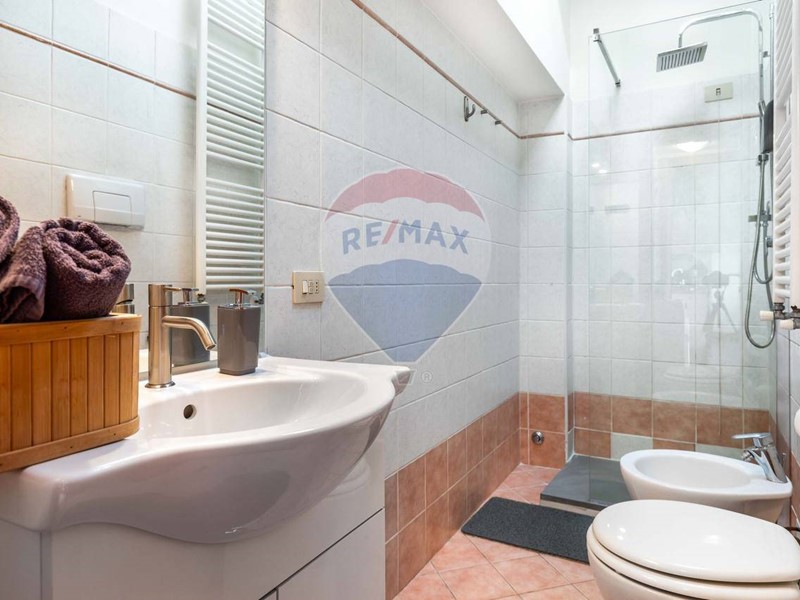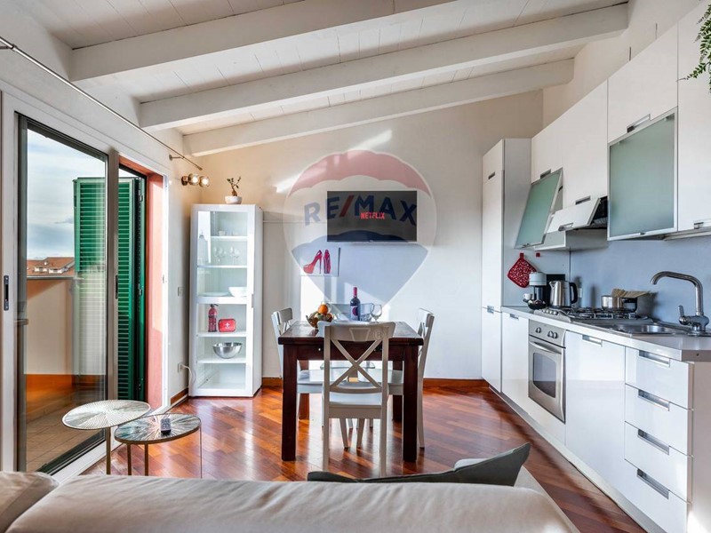 Finiture di livello: parquet in tutti gli ambienti, aria condizionata sia in camera che in soggiorno, travi a vista laccate bianche e ampie porte-finestre che garantiscono ottima luminosità e continuità visiva.