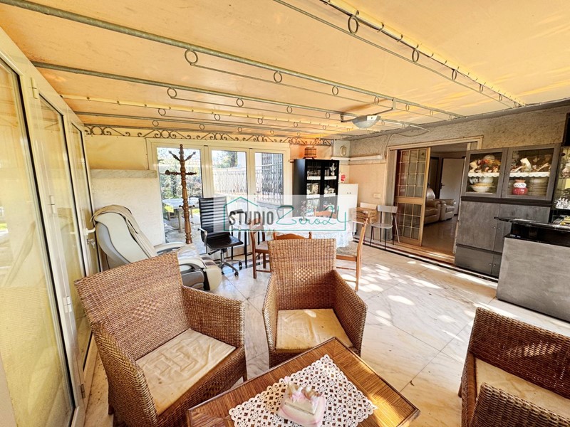 La prima unità al piano terra composta da: ingresso, cucina abitabile con uscita sul giardino, ampia zona giorno, vano scala, due camere entrambe con balcone ed un bagno al piano mezzanino. A corredo, al piano seminterrato con accesso sia dall'interno che dall'esterno, troviamo l'ampia taverna con cucina abitabile, un bagno ed uscita su veranda esterna vivibile, affacciata sul giardino.