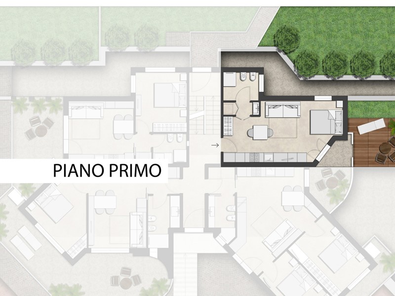 Diverse tipologie con ingresso indipendente, monolocali, bilocali e trilocali tutti con giardini e terrazzi, totalmente allestiti con arredi da esterno.