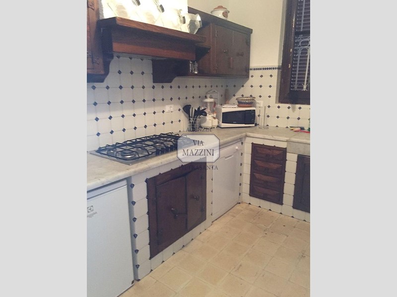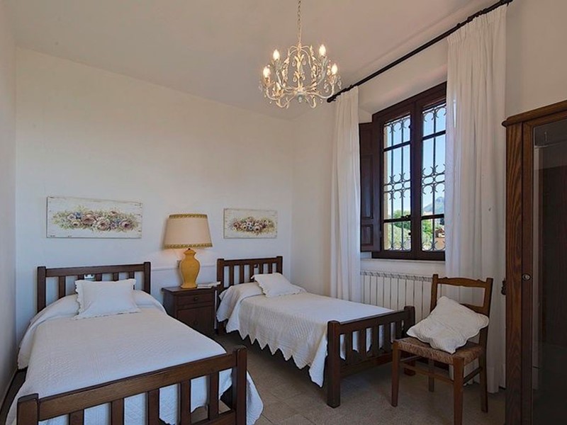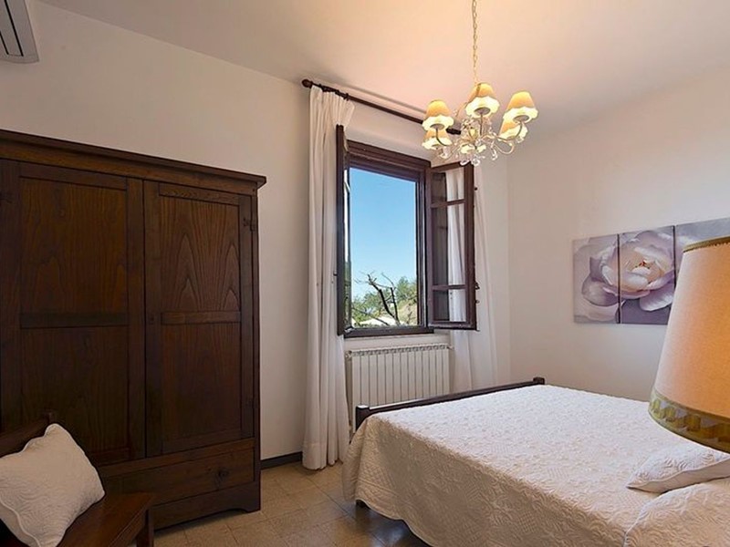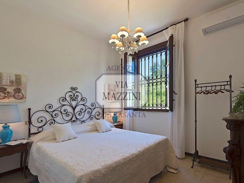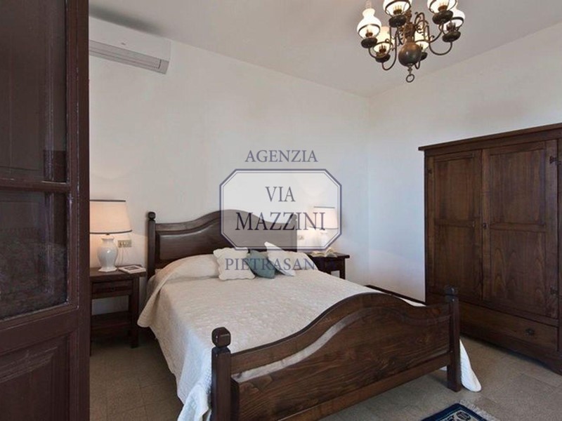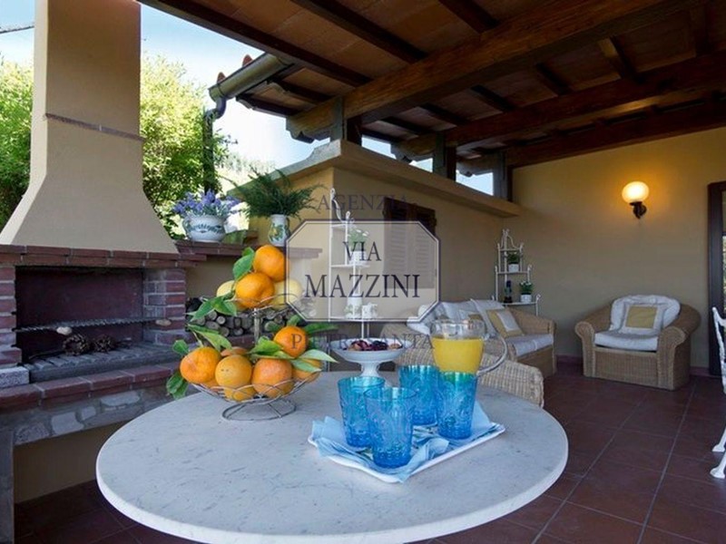 Si sviluppa su 2 piani abitativi ed è così articolata: Accedendo alla casa attraverso il porticato, si apre su un Open Space con sala pranzo e soggiorno con camino e accesso diretto al giardino attrezzato, di lato al soggiorno, si accede alla cucina attrezzata e ad uno studio con camino, un bagno con doccia e ripostiglio con lavanderia con porta finestra che da sul retro del giardino. Tramite una rampa di scale in pietra serena, si accede al piano superiore, composto da 4 camere matrimoniali di cui una con grande terrazza con vista mare e sulla piscina, una camera a due letti e due bagni, uno con doccia ed uno con vasca.
