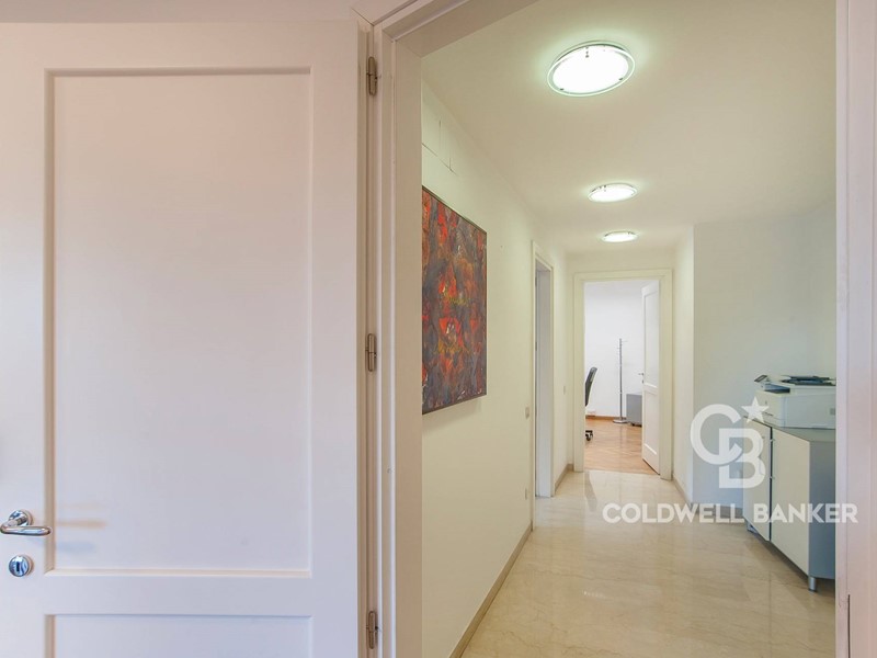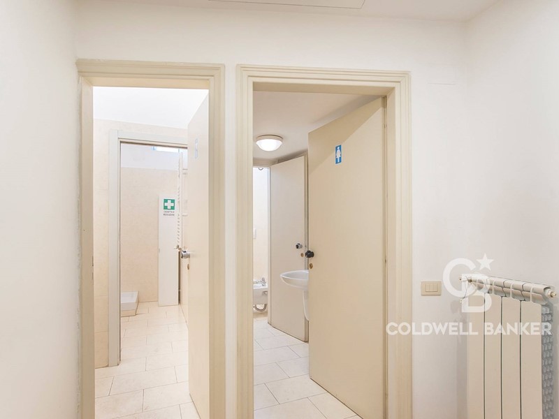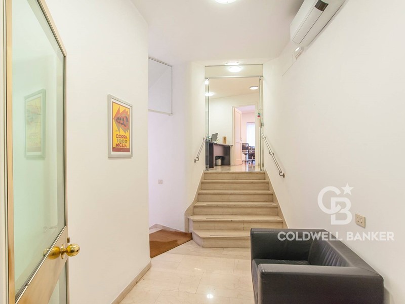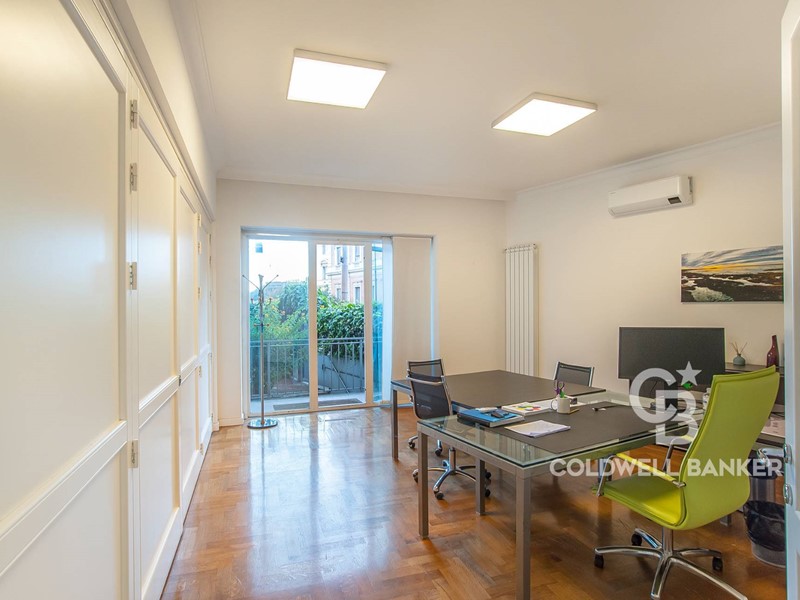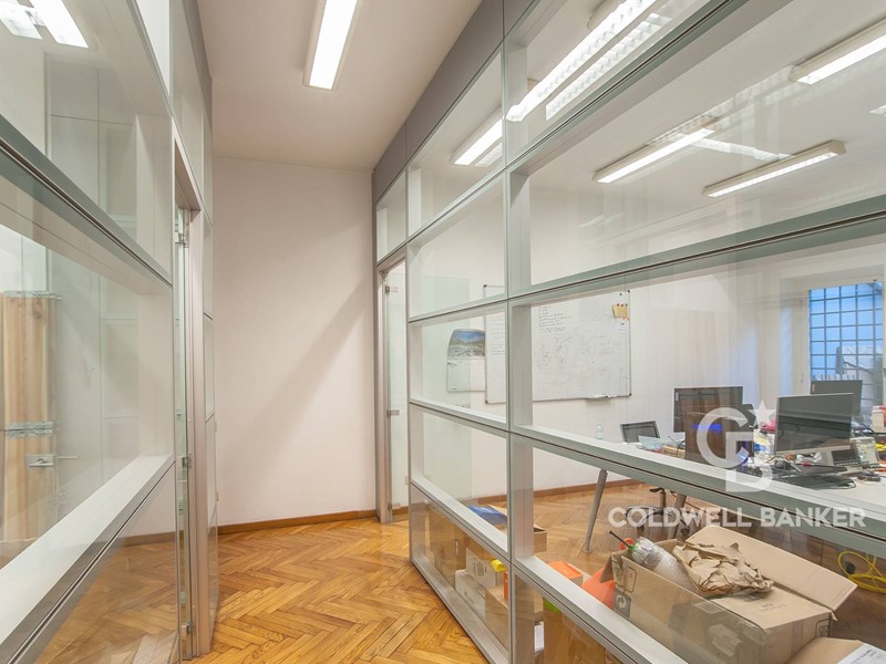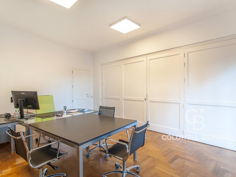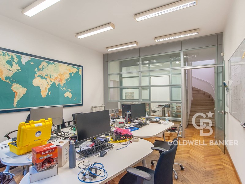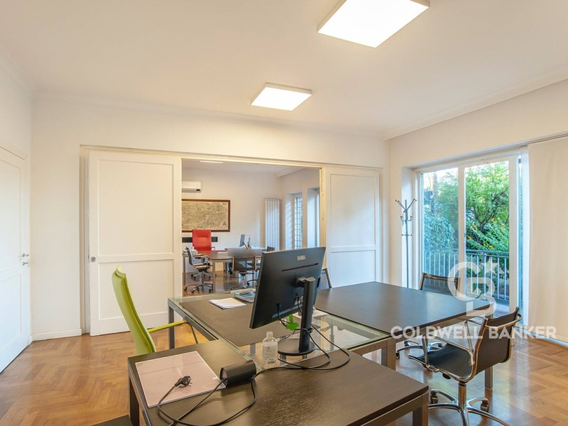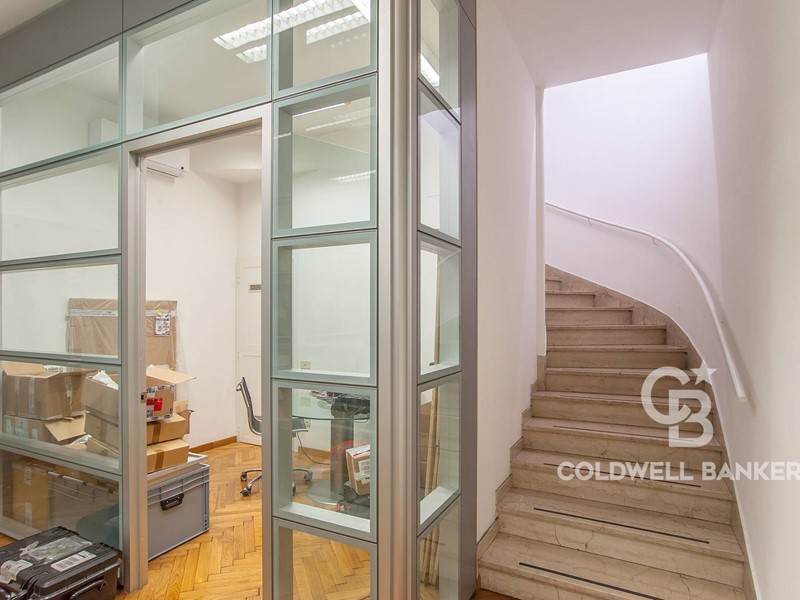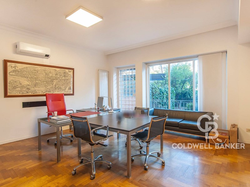 Una comoda scala in marmo conduce al piano inferiore, arioso e luminoso con grandi vetrate scorrevoli sul giardino e composto da 3 stanze, una sala server, 2 bagni attigui. Recentemente ristrutturato l'ufficio si presenta in perfetto stato manutentivo, dispone di riscaldamento autonomo, aria condizionata, cablaggio, pavimenti in parquet, pareti divisorie in doppio vetro e acciaio nella zona operativa.