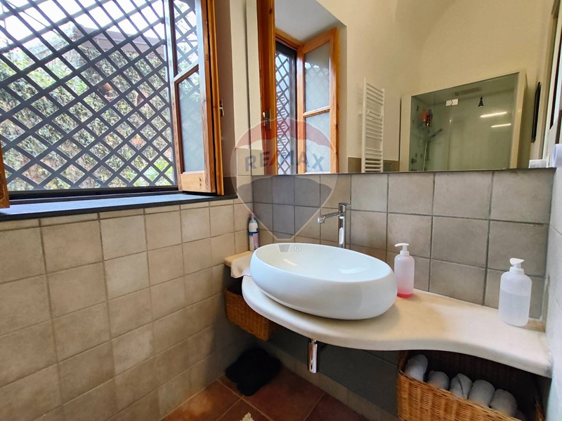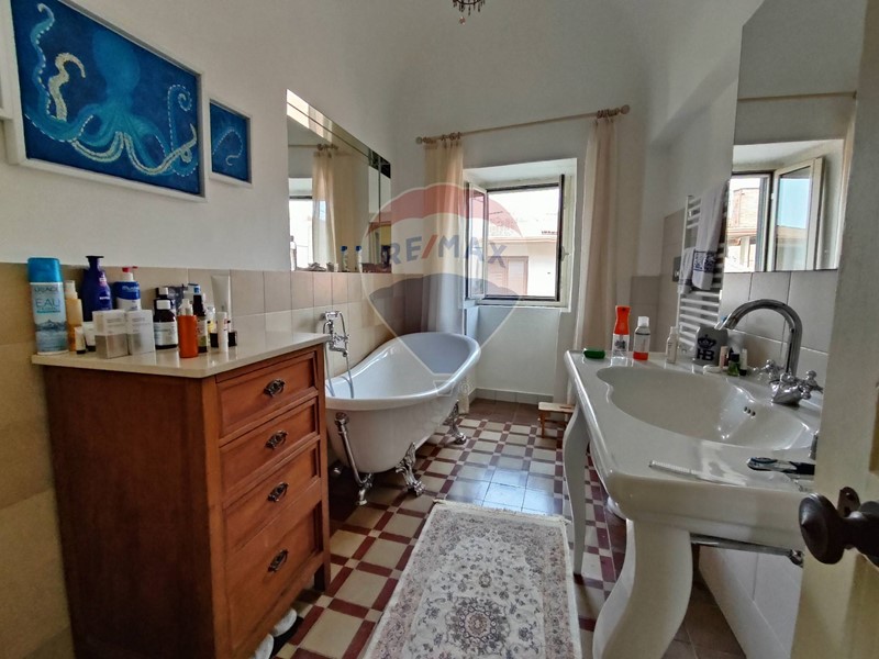 Salendo al primo piano, la pavimentazione originale d'epoca cattura immediatamente lo sguardo, mantenendo viva l'atmosfera suggestiva del passato. Qui si trovano le camere da letto: una delle quali con bagno privato, ideale per godere di una privacy esclusiva, e il bagno principale, caratterizzato da una raffinata vasca freestanding in stile classico con piedini in ferro, che evoca atmosfere sofisticate e rilassanti.