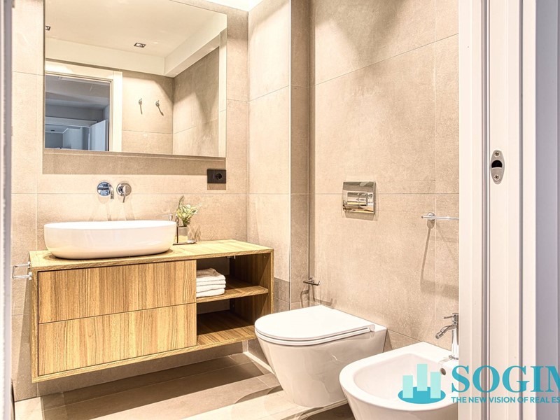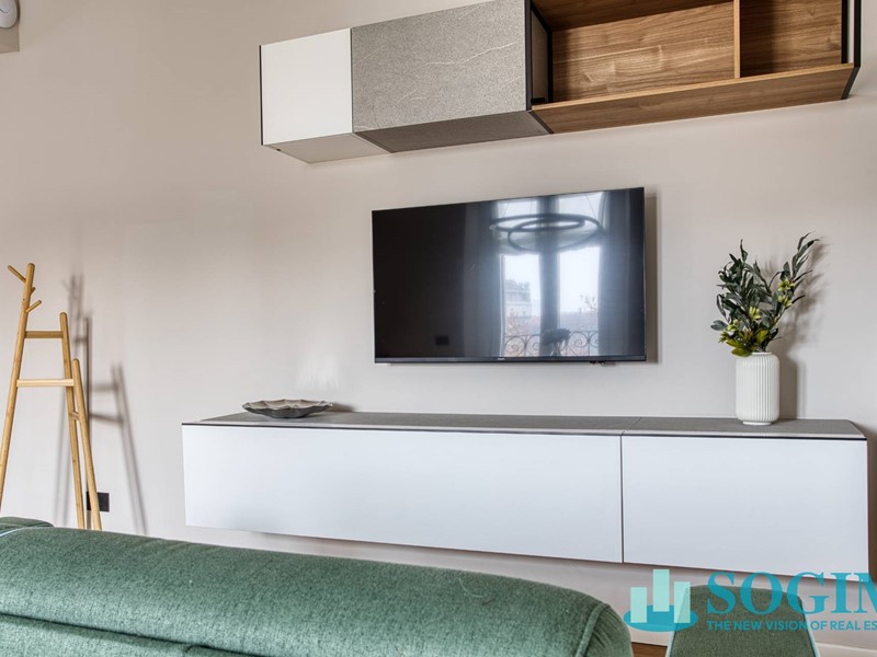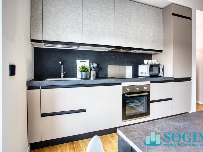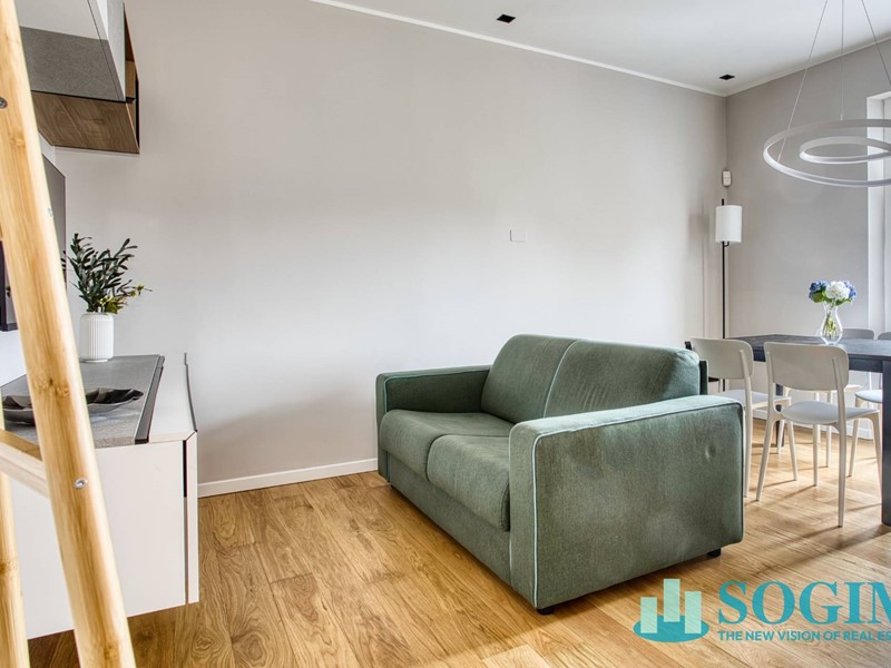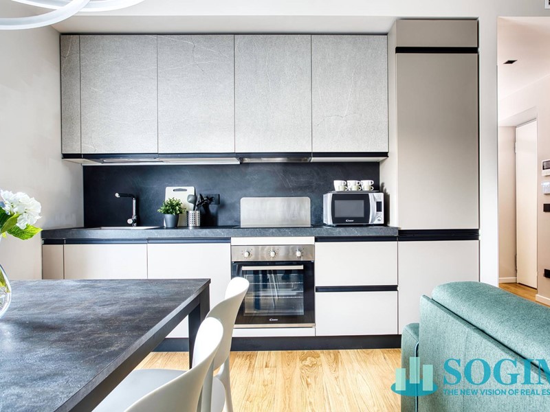 L'ingresso si apre su un disimpegno da cui si accede alla zona living con funzionale cucina a vista completamente accessoriata di elettrodomestici in classe A e piano cottura ad induzione, divano letto e parete attrezzata con TV smart ed affaccio sul parco di Largo Marinai d'Italia.