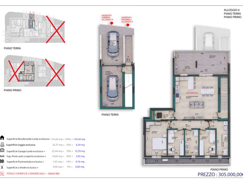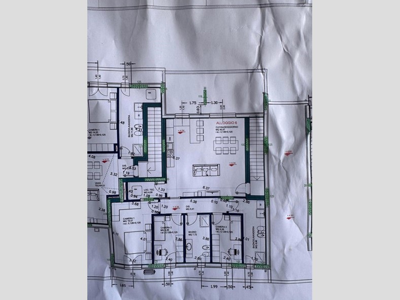 Composizione interna: zona giorno open-space con cucina e soggiorno, disimpegno, tre camere da letto, doppi servizi /lavanderia.