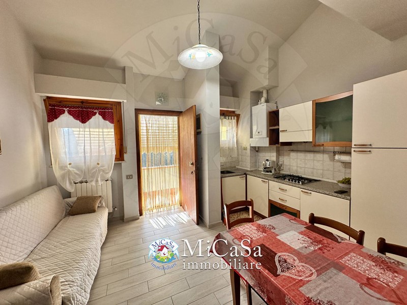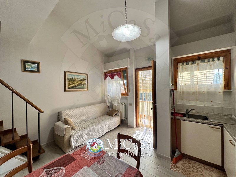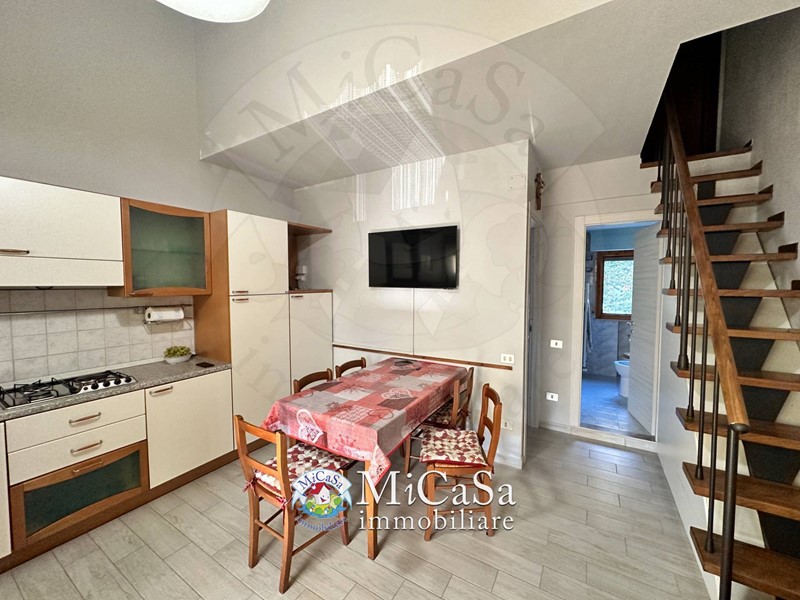 Composto al primo piano da ingresso in soggiorno con angolo cottura, bagno con box doccia e camera media con letto matrimoniale . Al piano soppalcato troviamo camera e bagno di servizio.