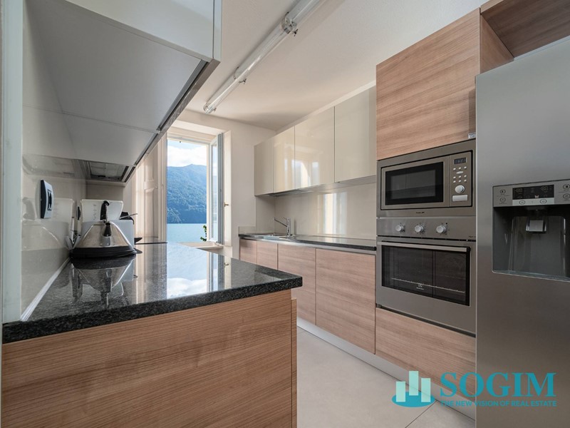 Proseguendo verso la zona living si accede alla comoda cucina abitabile vista lago, arredata ed attrezzata con elettrodomestici marche top di gamma, e all'ampio salone con finestre panoramiche e con affaccio su un peculiare terrazzo dove poter godere di momenti di relax e di una vista mozzafiato.