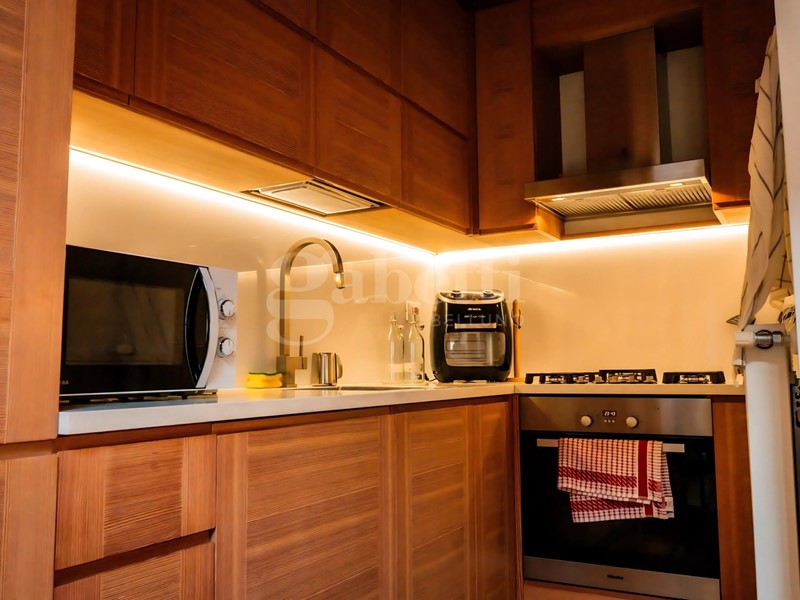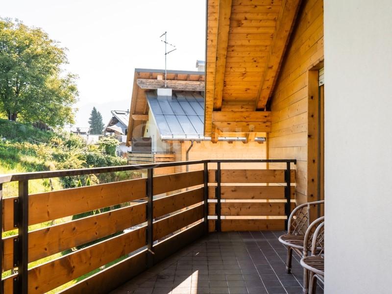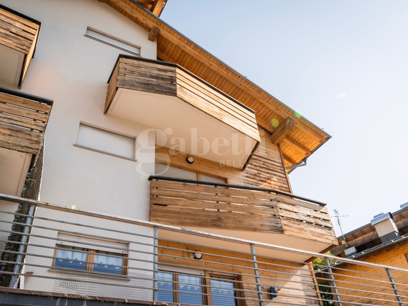 L'abitazione si sviluppa su due livelli e colpisce fin da subito per l'eleganza calda e naturale degli ambienti. La zona giorno si apre su un living luminoso con cucina completa di tutti gli elettrodomestici, salotto con stube tradizionale e velux automatico che garantisce luce e comfort in ogni stagione. Dal soggiorno si accede a un ampio terrazzo affacciato sulle Dolomiti.