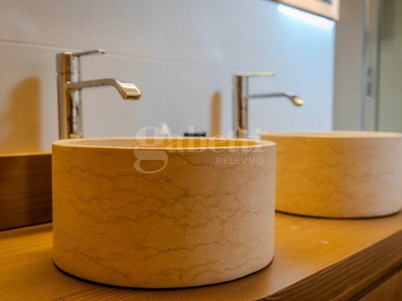 Salendo al piano superiore si viene accolti da una zona relax con poltrona e finestra panoramica sulle montagne. Completa il livello un secondo bagno, ampio e ben rifinito, dotato di doppio lavabo in pietra e doccia emozionale moderna.