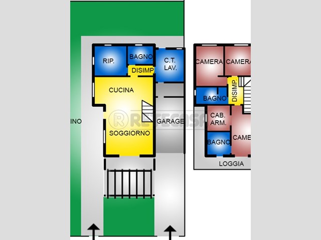 Infine completano la proprietà un ampio garage con basculante motorizzato, un posto auto privato ed un giardino di circa 250 mq disposto su tre lati.