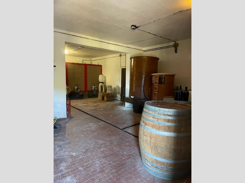 locali ad uso cantina al piano terreno – due capannoni agricoli – un piccolo fabbricato con forno a legna e vari piccoli locali ad uso ripostiglio/pollai con sovrastante grande terrazzo. Terreno agricolo coltivato in gran parte a seminativo ed il restante