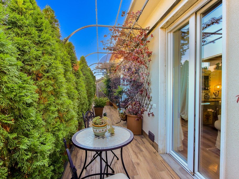 Dal balcone è possibile godere di una vista spettacolare sulla città e sulle montagne circostanti.La zona notte, invece, ospita due spaziose camere da letto e un bagno. Al piano superiore troviamo uno studio e il secondo bagno.Un ulteriore valore aggiunto è dato dal terrazzo, perfetto per rilassarsi e godere del sole e dell'aria fresca. Completano la proprietà una comoda cantina. Il riscaldamento è centralizzato, l'impianto di aria condizionata assicura confort in tutte le stagioni.