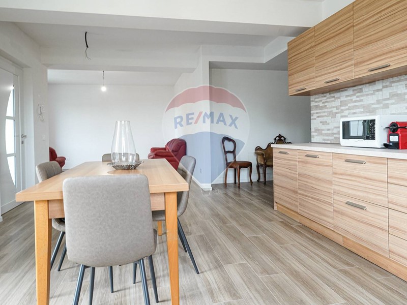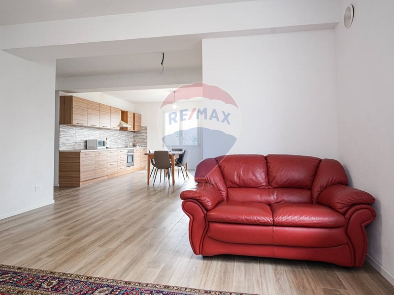 Soggiorno e cucina in open space con uscita su un terrazzo panoramico ideale per pranzi e cene allaperto.