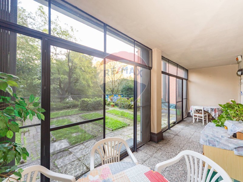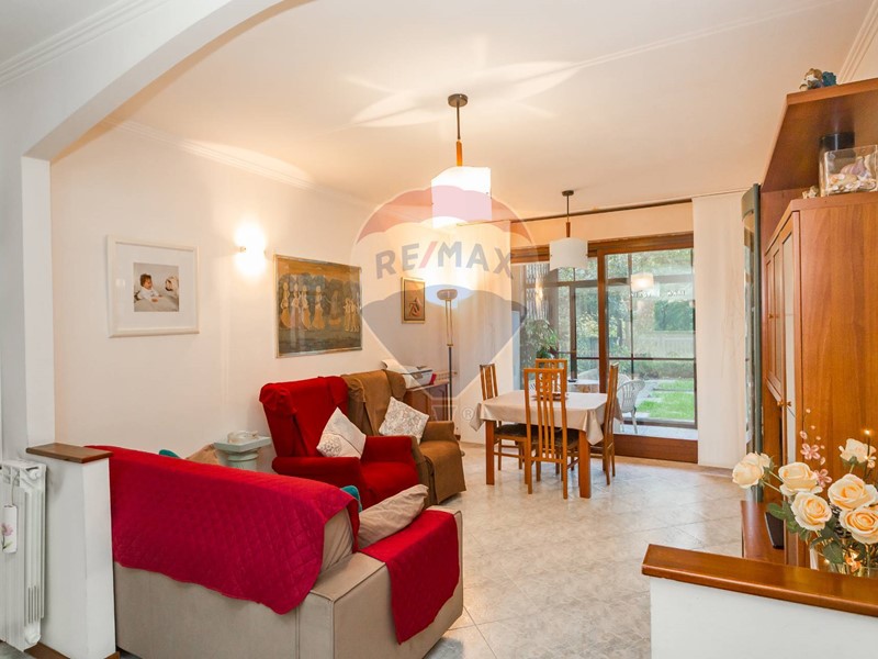 Dall'ingresso si accede ad un ampio soggiorno di 22 mq, accogliente e luminoso grazie alla doppia esposizione, servito da una grande veranda con zanzariera, perfetta per pranzi, cene o momenti di relax, che si apre sul giardino privato di 54 mq: uno spazio prezioso dove vivere a contatto con la natura senza rinunciare alla comodità della città.