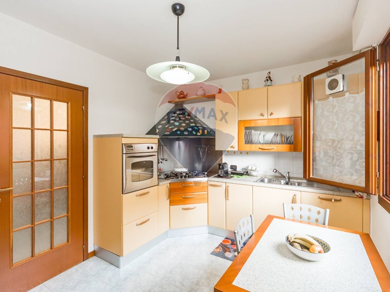 La cucina abitabile di 14.5 mq, completamente attrezzata, gode di un pratico sfogo esterno utilizzabile come lavanderia o area di servizio.