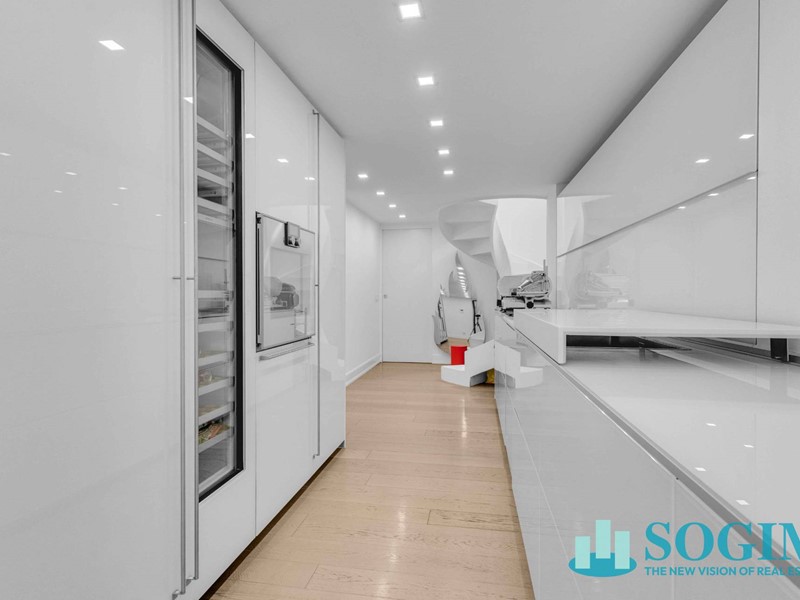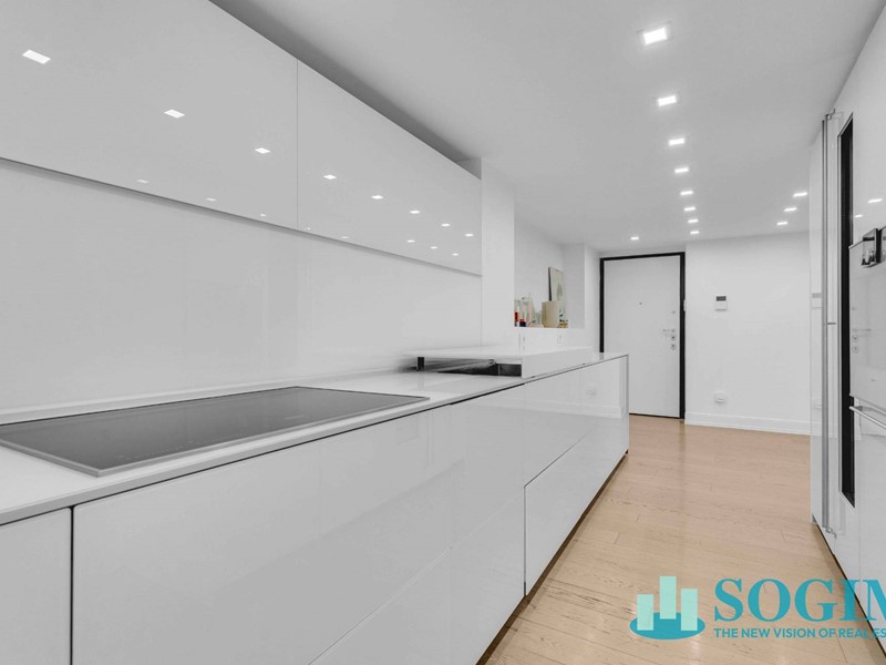 La cucina Valcucine è un autentico gioiello di design: un blocco in cristallo bianco e alluminio, con piano cottura a induzione Miele, forno e cantina vini Gaggenau a doppia zona climatica. Lo spazio cucina, pur rimanendo a vista, è separabile dal soggiorno grazie a raffinate porte scorrevoli Velaria di Rimadesio, in finitura bianco latte opaco con pannello in vetro specchiato.
