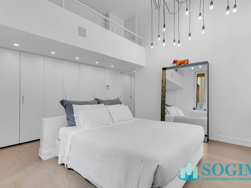 Una scala interna in resina collega il soggiorno al piano soppalcato, che ospita unarea lavanderia, un locale hobby e una parete attrezzata con armadi su misura Porro. Questi ultimi si affacciano direttamente sulla camera matrimoniale sottostante, creando una scenografia architettonica di grande fascino e funzionalità, con una continuità visiva che esalta lo spazio e la luce.
