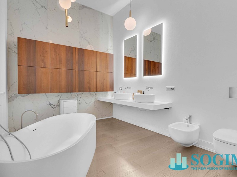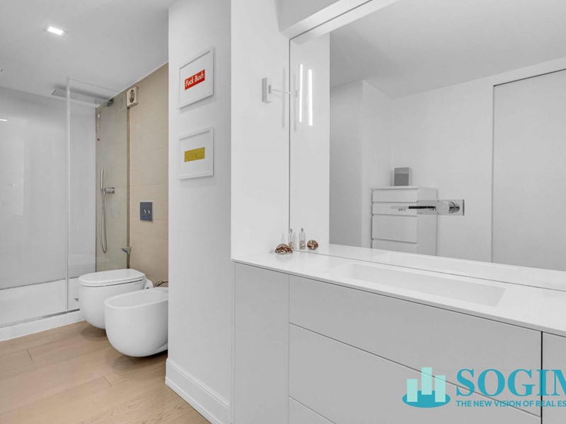 La zona notte è composta da due camere da letto, di cui una matrimoniale con bagno en suite caratterizzata da vasca da bagno e mobilio interamente firmati Boffi, doppi lavabo in ceramica oltre ad una doccia in muratura e piatto gres. Il secondo bagno, cieco ma dotato di aerazione forzata, è a servizio della zona giorno e della seconda camera.