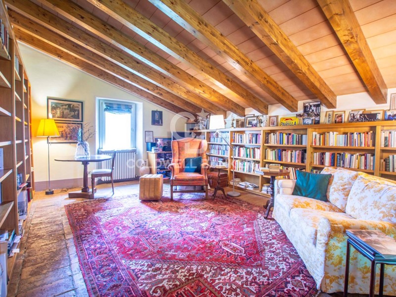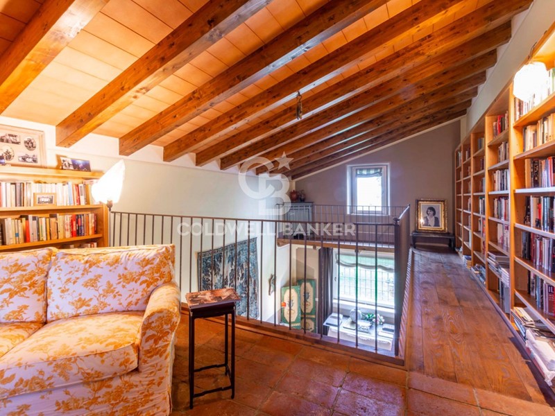 ' Primo piano: quattro ampie camere da letto, una stanza guardaroba, un bagno e una biblioteca caratteristica, ideale come spazio dedicato alla lettura o allo studio.